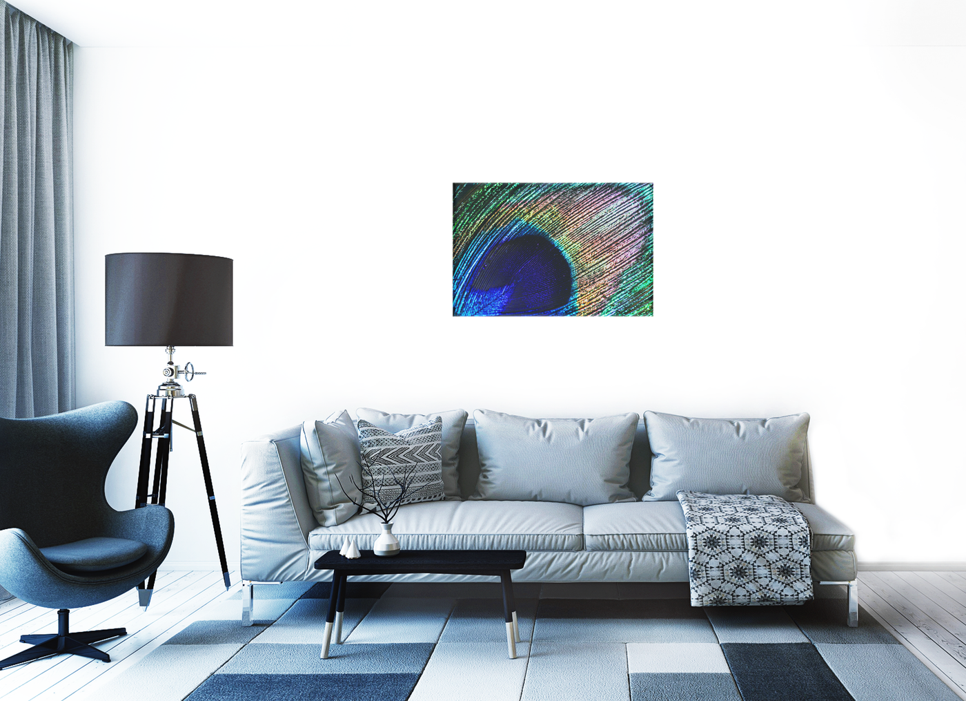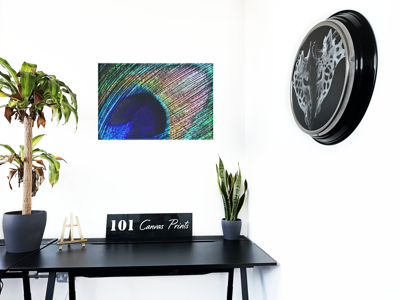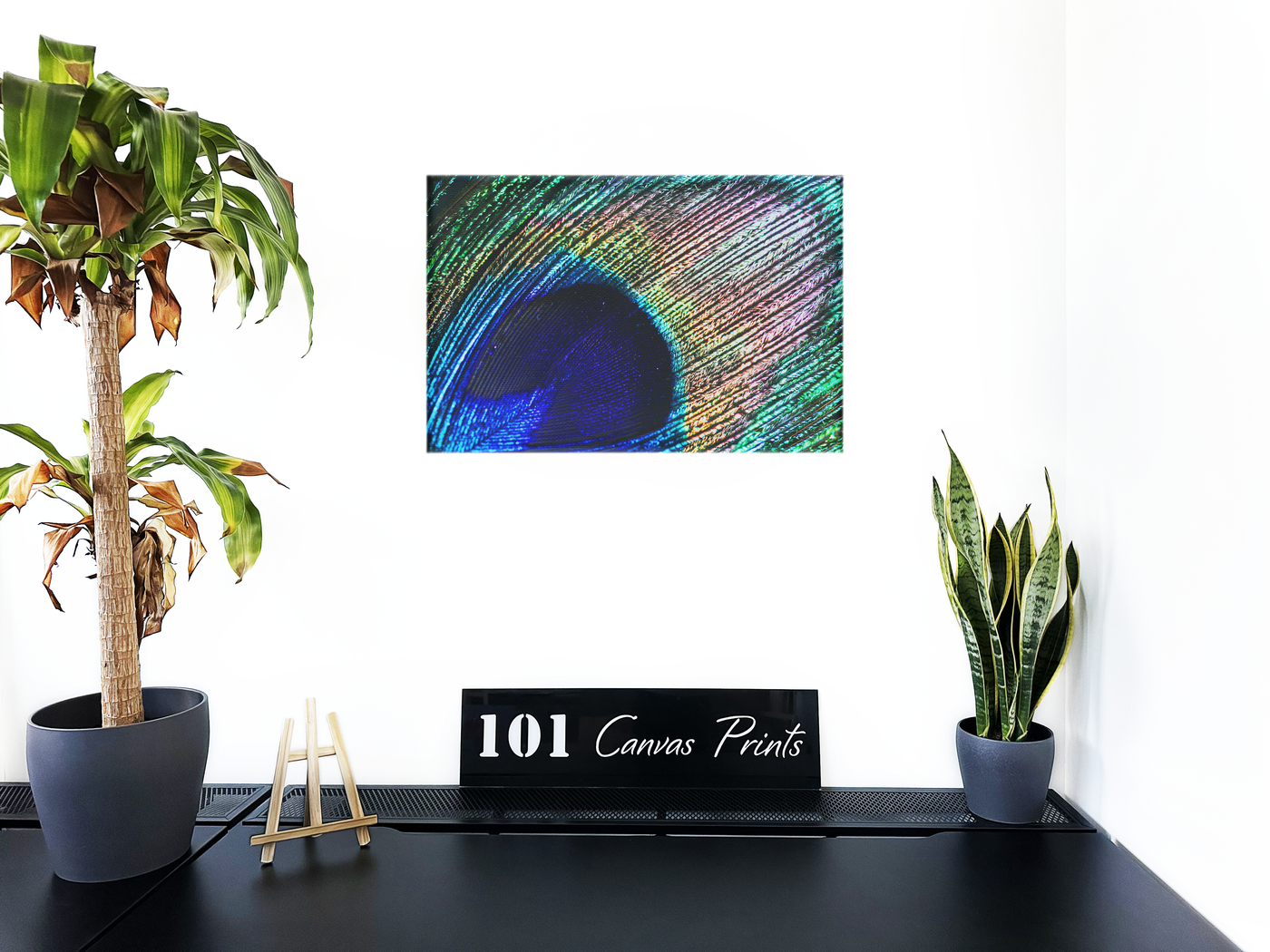 The colour palette is a spectacular display of nature's artistry, expertly rendered by the 101 Canvas Prints team. A deep, royal blue dominates the central eye, gradually transitioning to electric turquoise, then giving way to a mesmerising array of greens, golds, and subtle pinks. The lighting technique employed by the photographers accentuates the feather's iridescent quality, creating a shimmering effect that seems to bring the image to life. The intricate texture of the barbules is captured in stunning detail, revealing the complex structure that creates the feather's unique, eye-catching appearance.