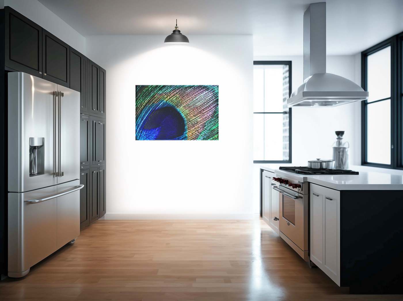 This mesmerising close-up of a peacock feather, masterfully captured by the 101 Canvas Prints photography team, showcases the breathtaking intricacy of nature's design. The image presents a broader view of the feather, emphasising the radiant patterns that emanate from the central 'eye'. The composition expertly balances the deep, alluring centre with the vibrant, textured surroundings.