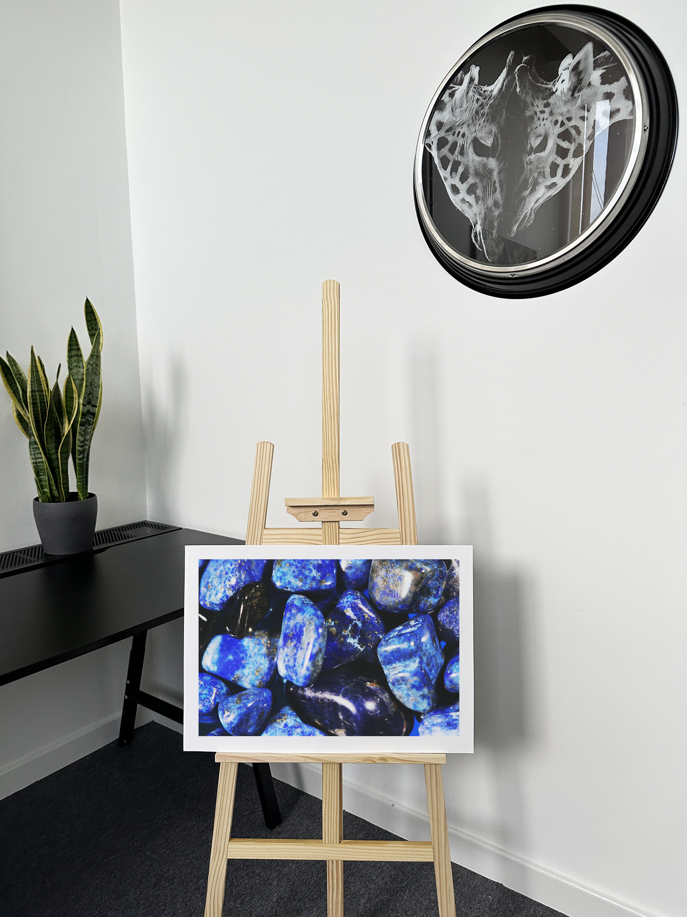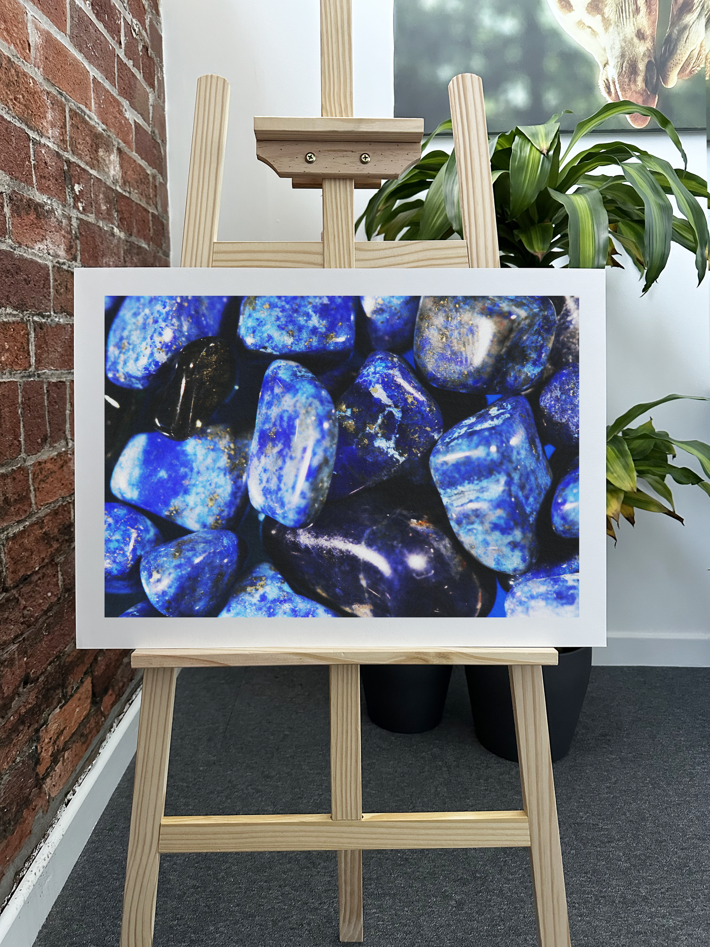 Our premium printing process ensures that every nuance of colour and detail is faithfully reproduced. The matte finish of the Fine Art paper reduces glare, allowing viewers to appreciate the intricate patterns and textures of the stones from any angle. This print brings out the organic beauty of the lapis lazuli, emphasising its connection to the earth and its long-standing significance in art and culture.