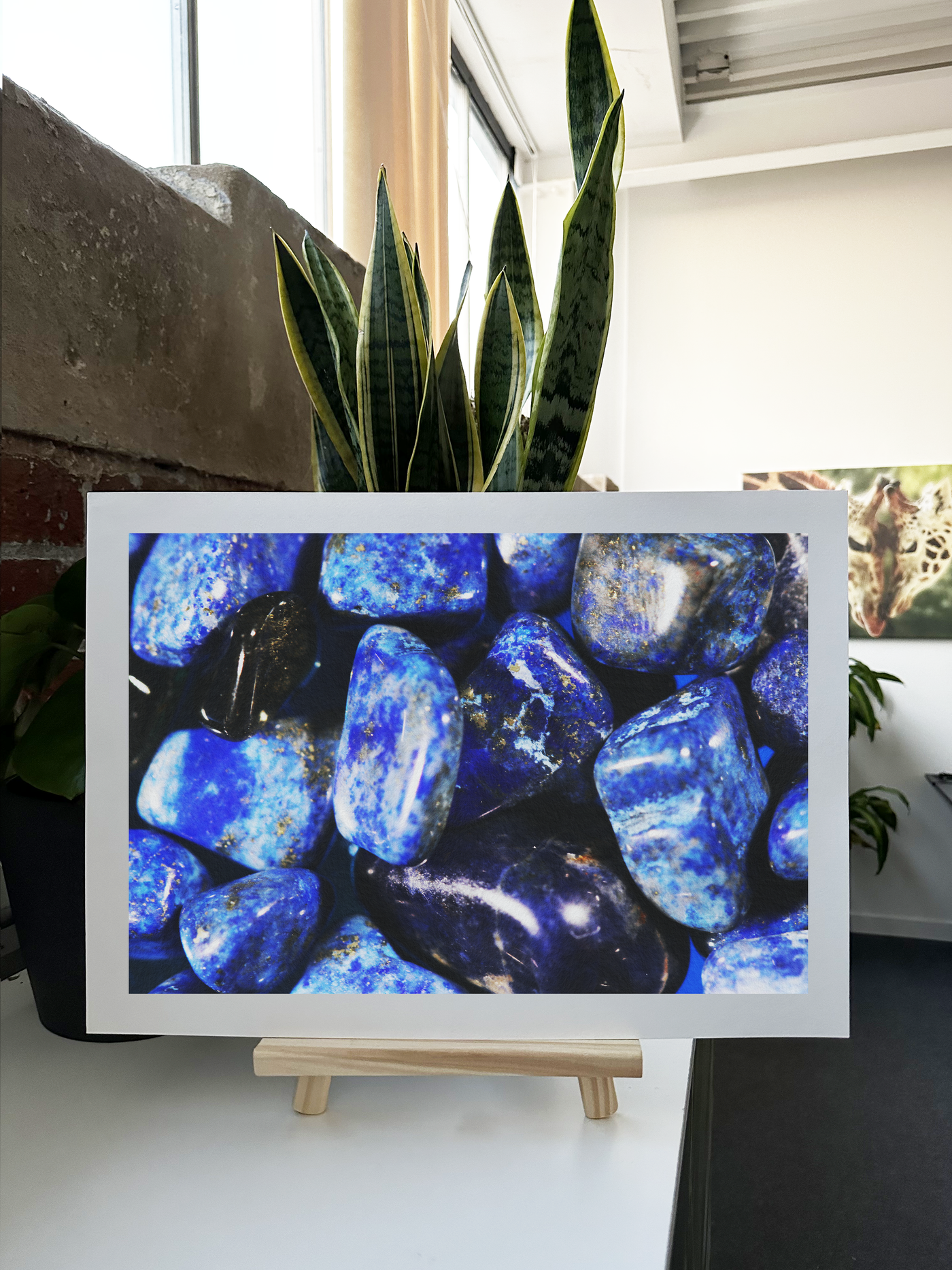 Our premium printing process ensures that every nuance of colour and detail is faithfully reproduced. The matte finish of the Fine Art paper reduces glare, allowing viewers to appreciate the intricate patterns and textures of the stones from any angle. This print brings out the organic beauty of the lapis lazuli, emphasising its connection to the earth and its long-standing significance in art and culture.
