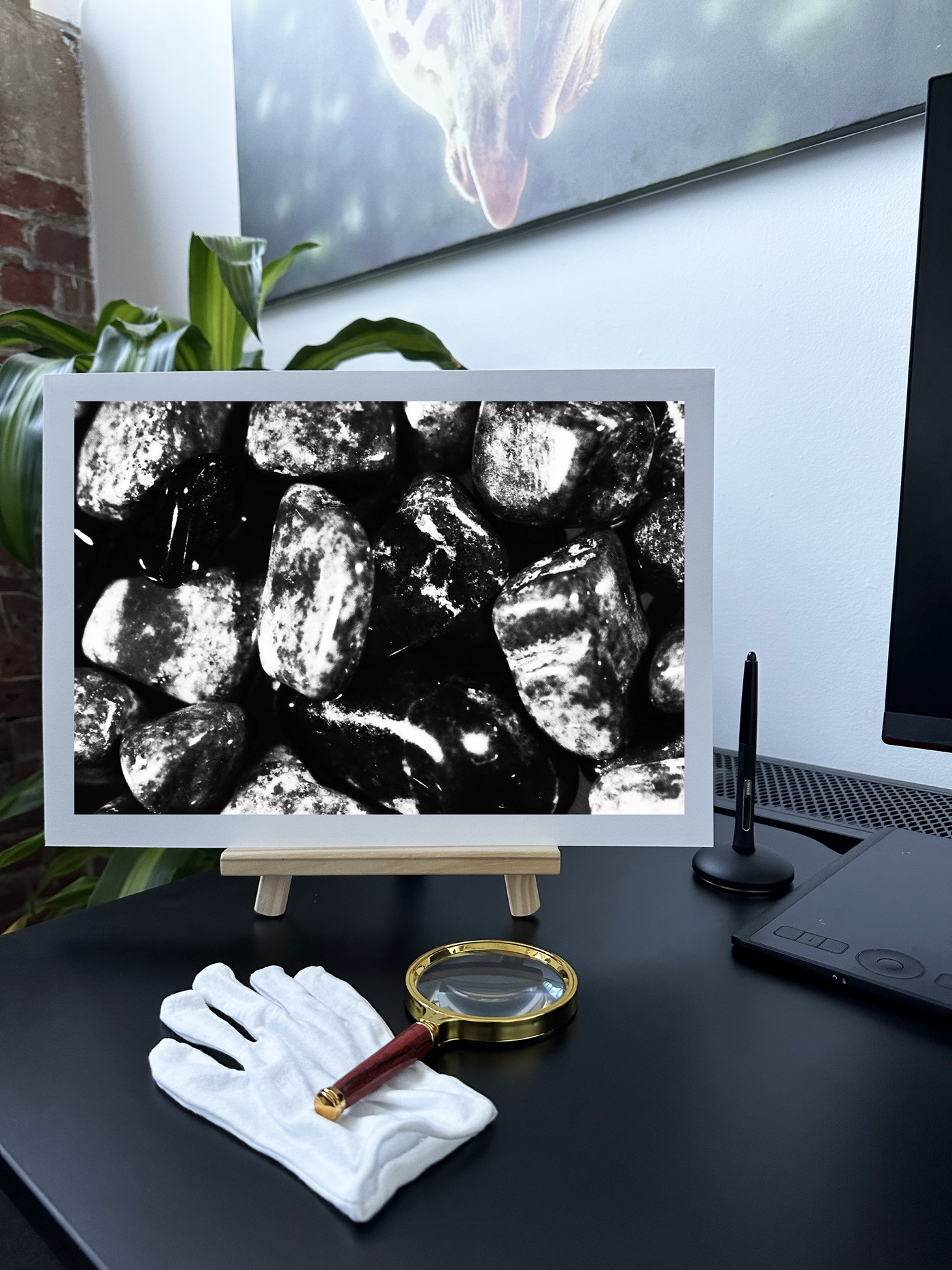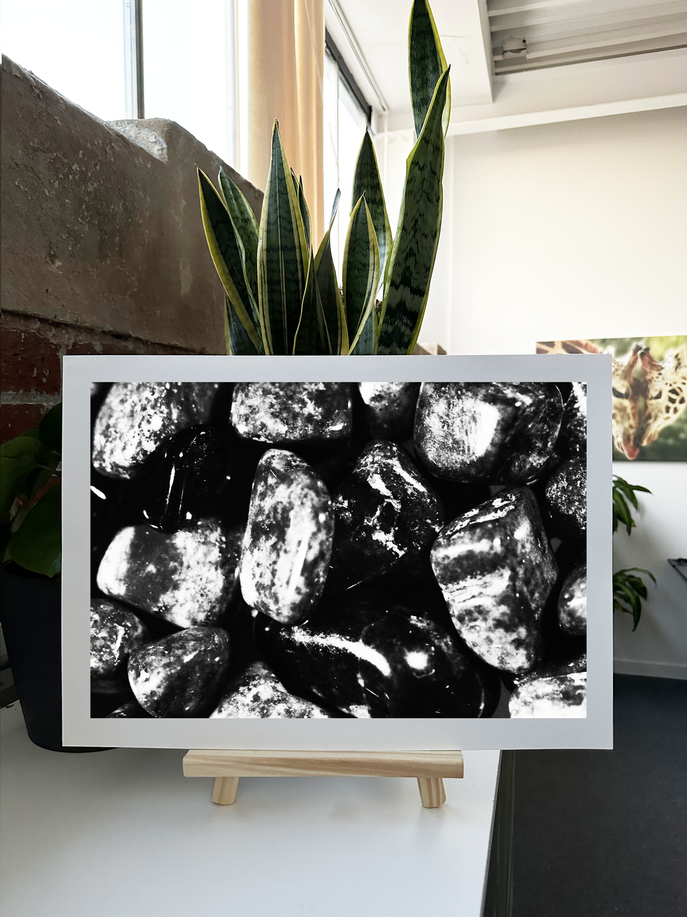 Our premium printing process ensures that every nuance of Monochromatic tonality and detail is faithfully reproduced. The matte finish of the Fine Art paper reduces glare, allowing viewers to appreciate the intricate patterns and textures of the stones from any angle. This print brings out the organic beauty of the lapis lazuli, emphasising its connection to the earth and its long-standing significance in art and culture.