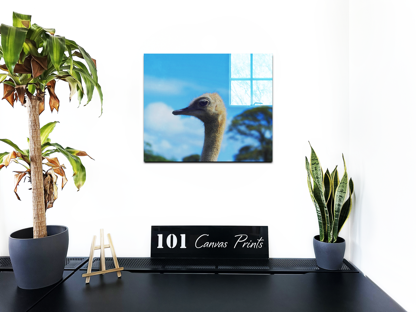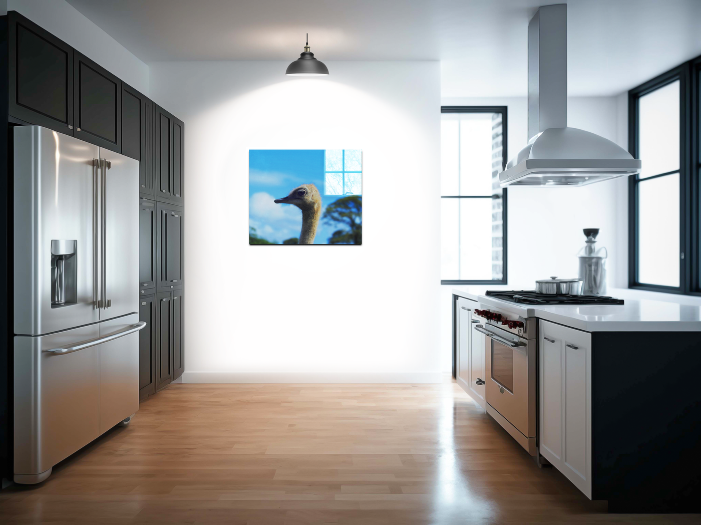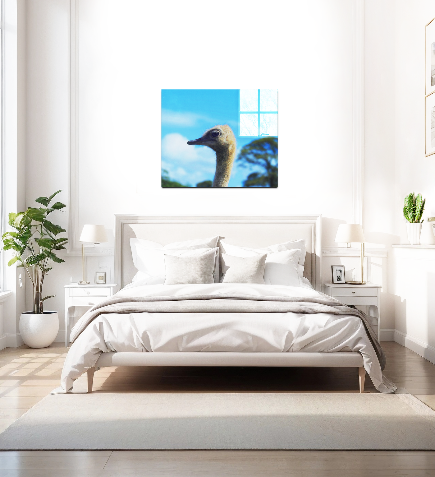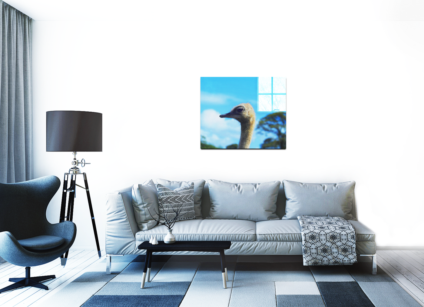 A charming piece of artwork in any home, this print of an ostrich's head is beautiful and vibrant in rich, high-definition detail. The beautiful tone of the ostrich is contrasted with a bright blue sky background, creating a stunning combination.