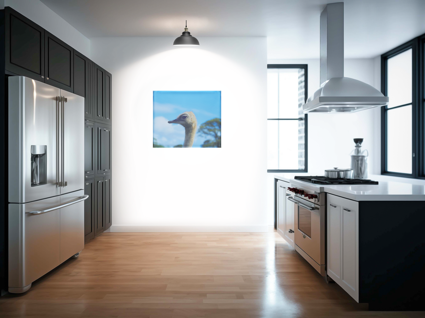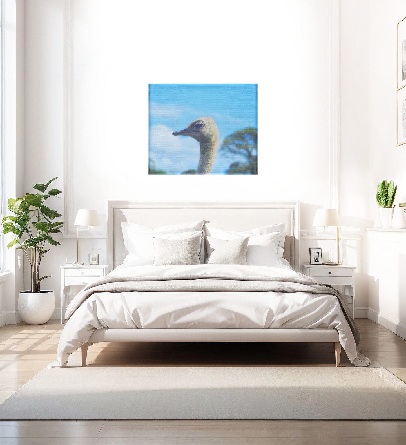 A charming piece of artwork in any home, this print of an ostrich's head is beautiful and vibrant in rich, high-definition detail. The beautiful tone of the ostrich is contrasted with a bright blue sky background, creating a stunning combination.