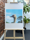A charming piece of artwork in any home, this Fine Art print of an ostrich's head is beautiful and vibrant in rich, high-definition detail. The beautiful tone of the ostrich is contrasted with a bright blue sky background, creating a stunning combination.