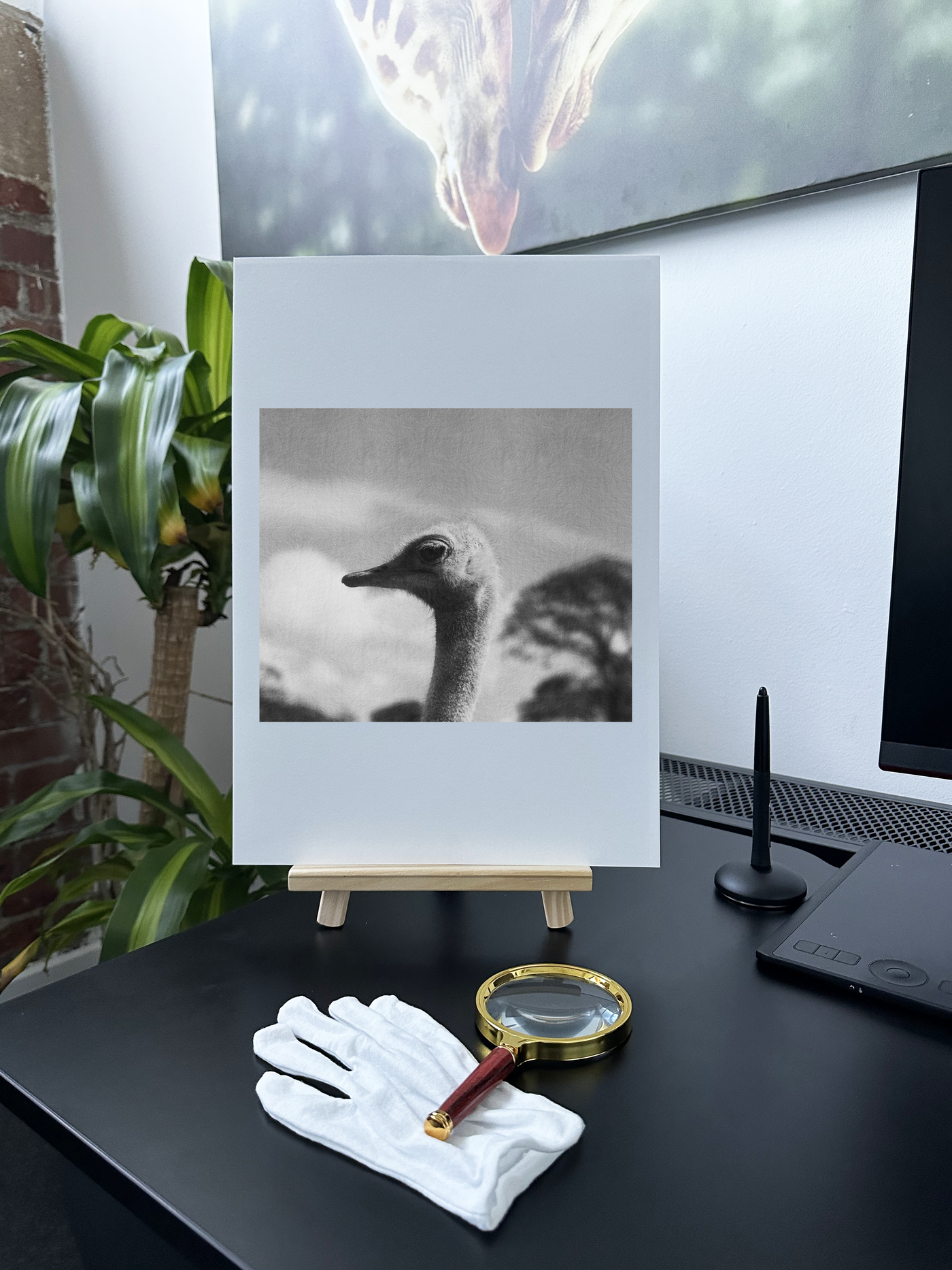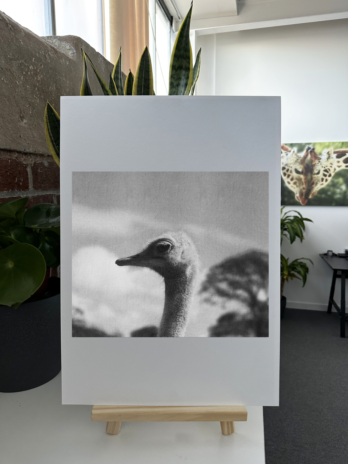 A charming piece of artwork in any home, this Monochrome Fine Art print of an ostrich's head is beautiful and vibrant in rich, high-definition detail. The beautiful tone of the ostrich is contrasted with a light sky background, creating a stunning combination.