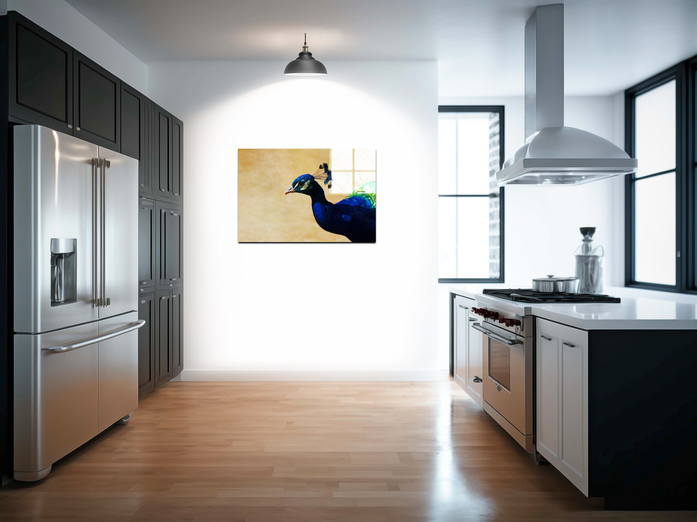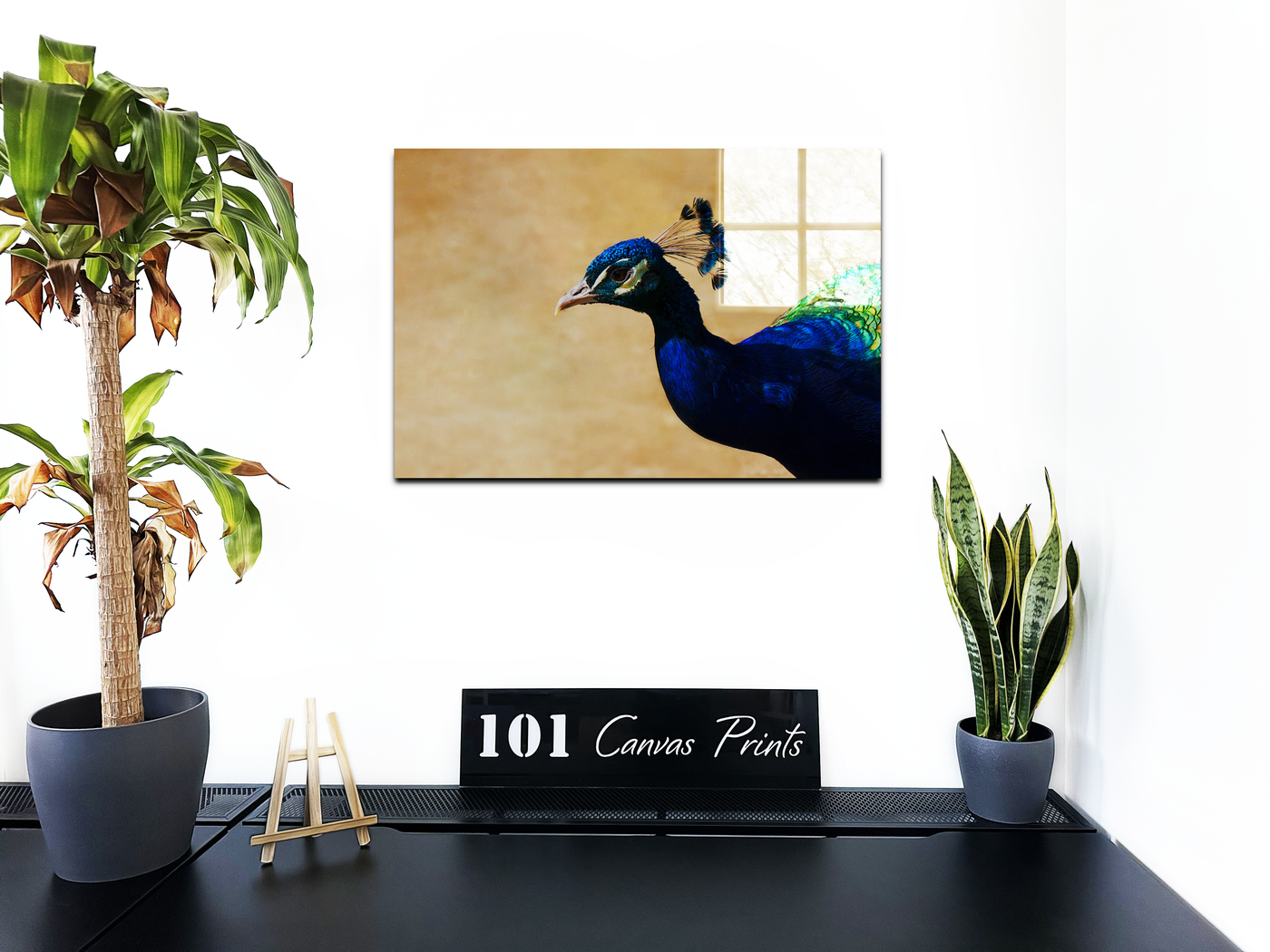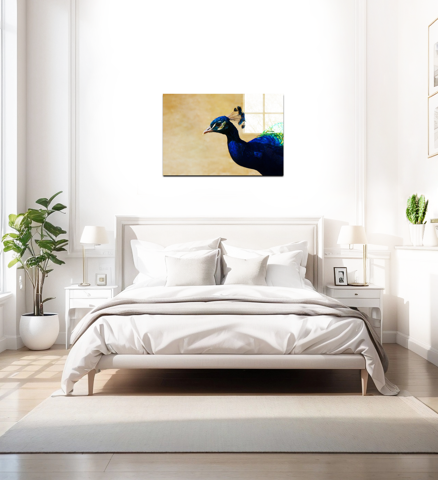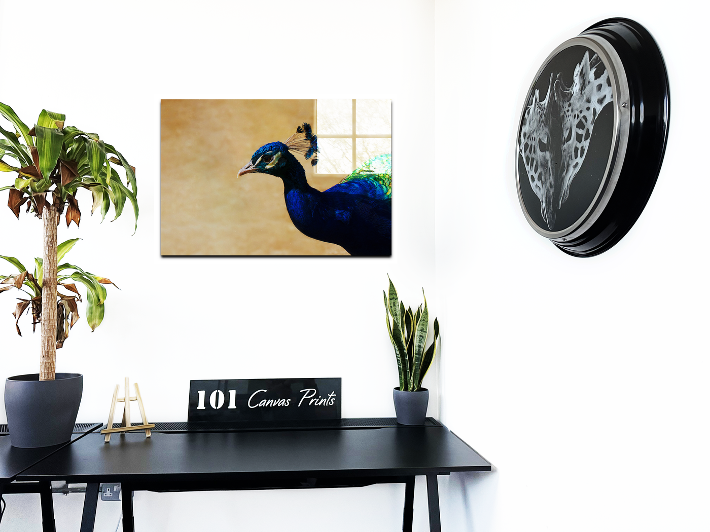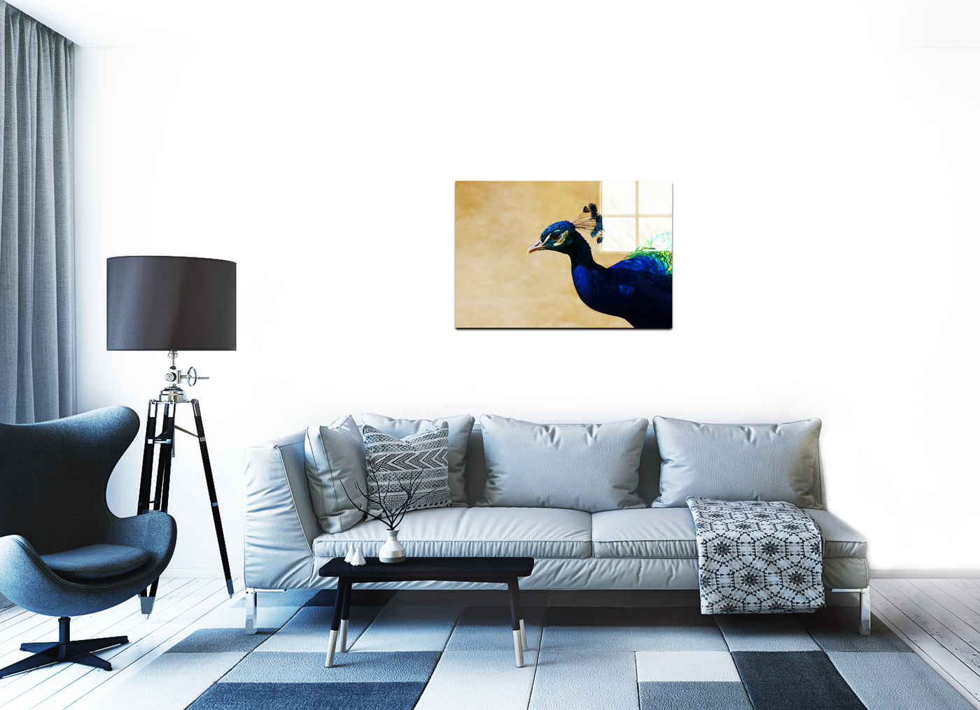 Acrylic art is the ideal way to add colour to your walls and brighten an open space. Our incredible high definition Acrylic print of a peacock against a sandy background will draw interest from anyone passing by. This Acrylic Art piece features vivid colours and bright turquoise hues that pop against the sandy brown backdrop. The muted background creates a subtle, soothing effect that's perfect for any living room, kitchen or bedroom.