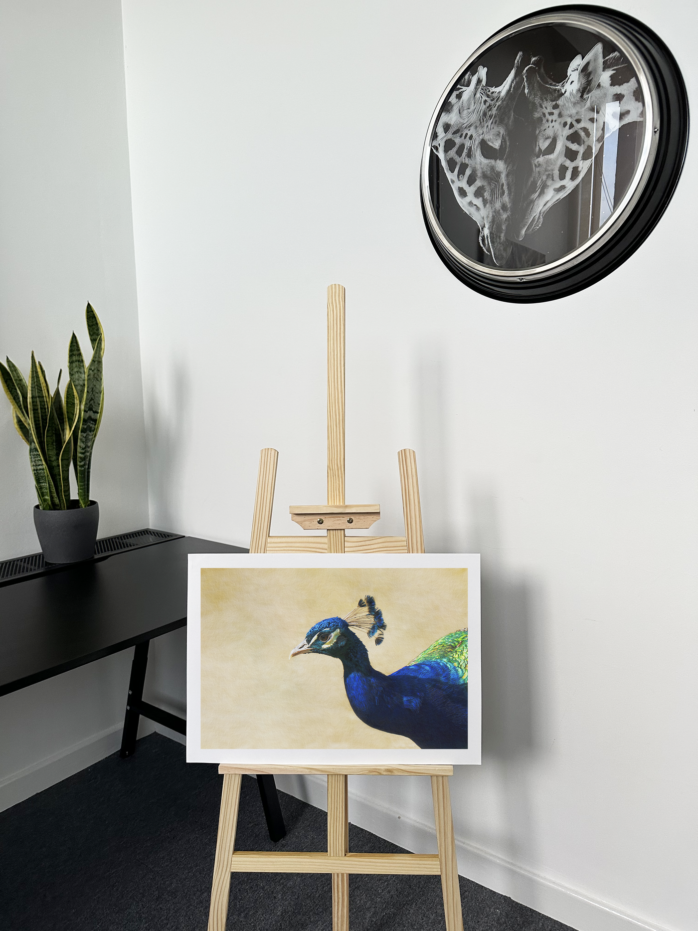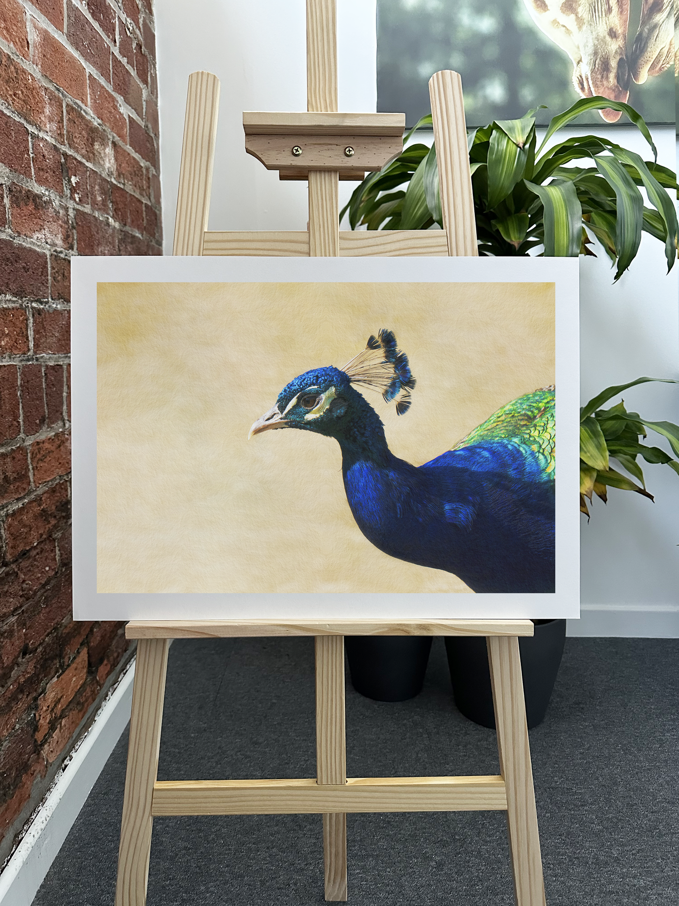 Fine Art prints are the ideal way to add colour to your walls and brighten an open space. Our incredible high definition print of a peacock against a sandy background will draw interest from anyone passing by. This Fine Art print features vivid colours and bright turquoise hues that pop against the sandy brown backdrop. The muted background creates a subtle, soothing effect that's perfect for any living room, kitchen or bedroom.