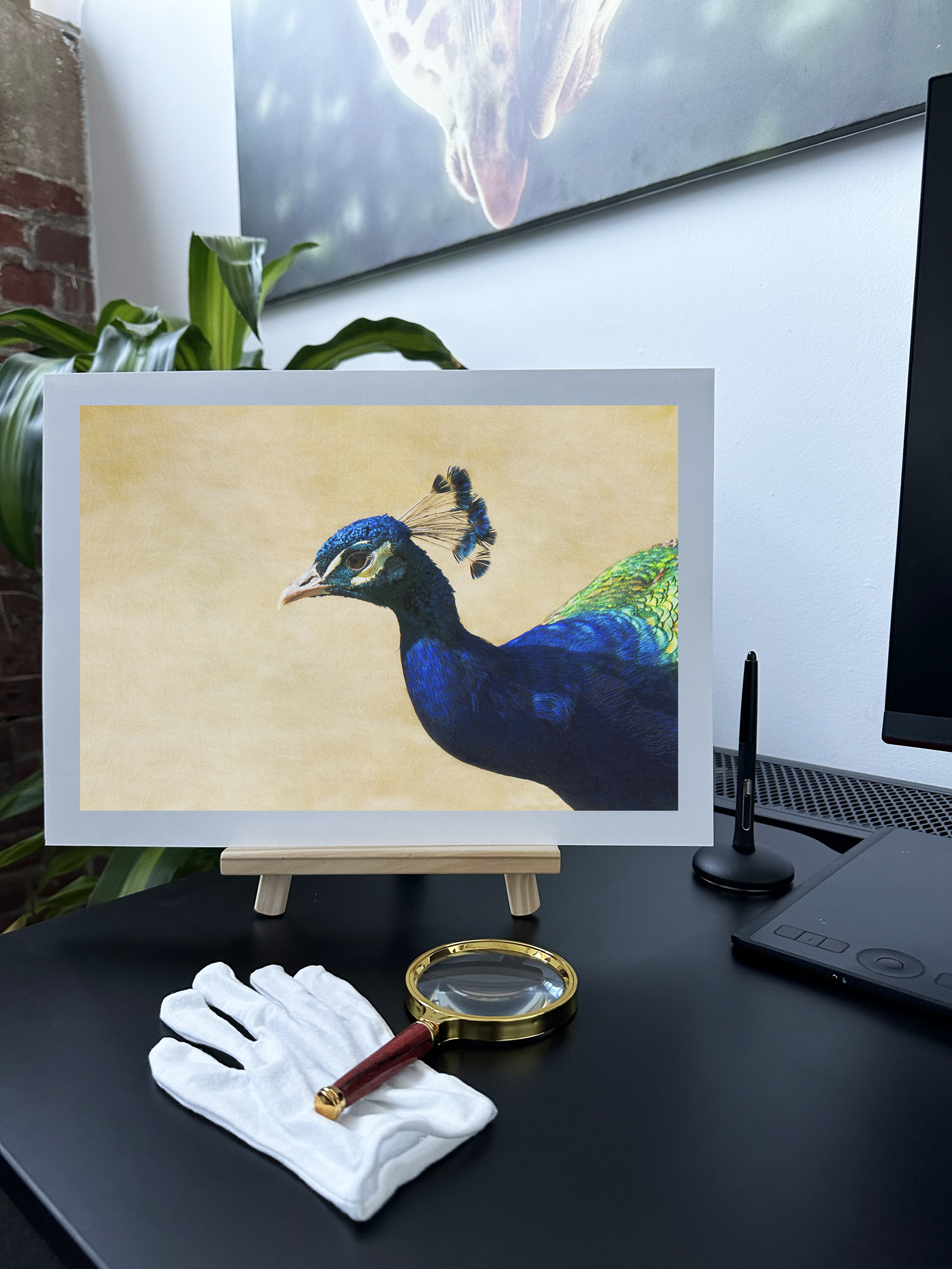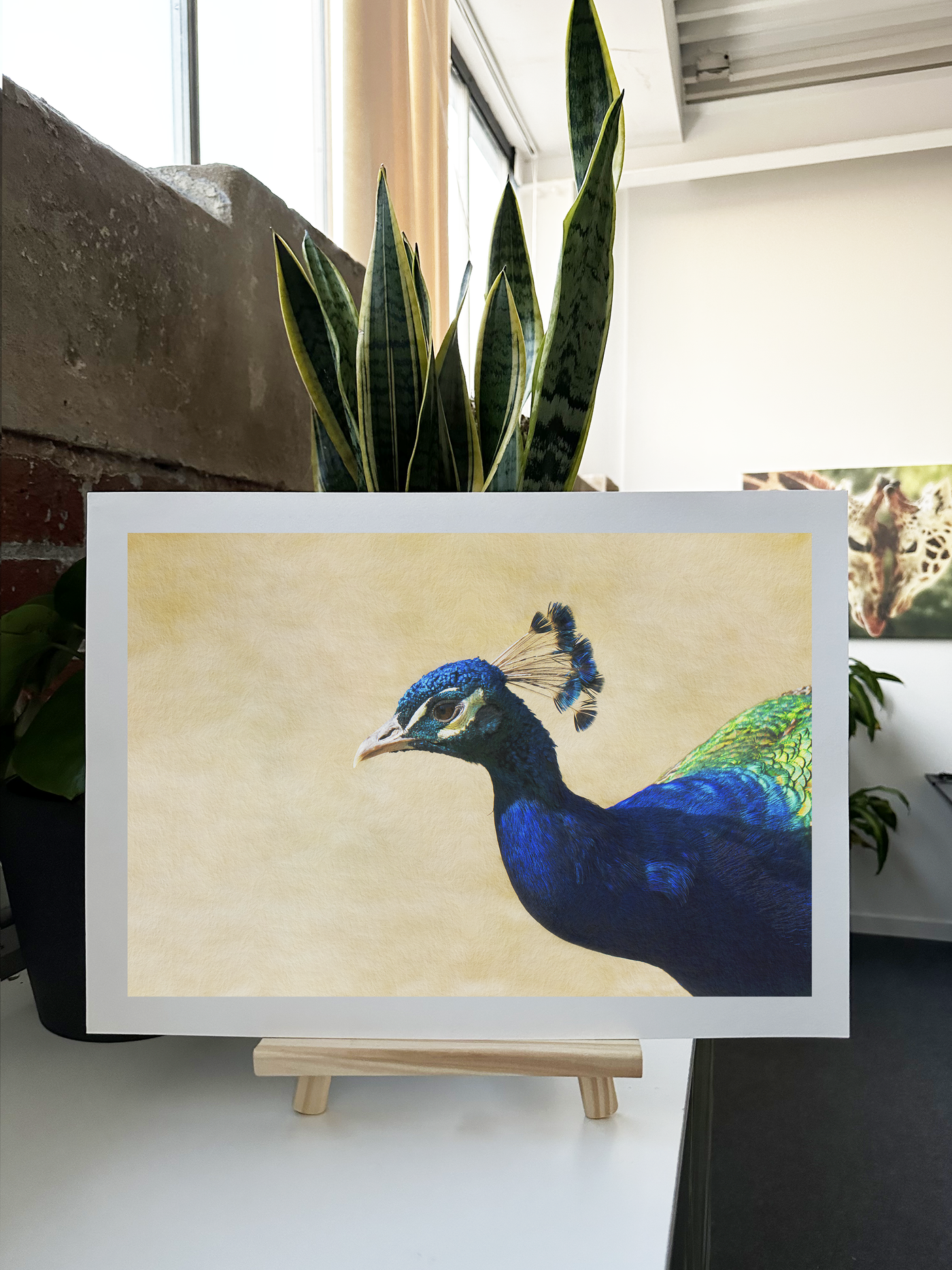Fine Art prints are the ideal way to add colour to your walls and brighten an open space. Our incredible high definition print of a peacock against a sandy background will draw interest from anyone passing by. This Fine Art print features vivid colours and bright turquoise hues that pop against the sandy brown backdrop. The muted background creates a subtle, soothing effect that's perfect for any living room, kitchen or bedroom.