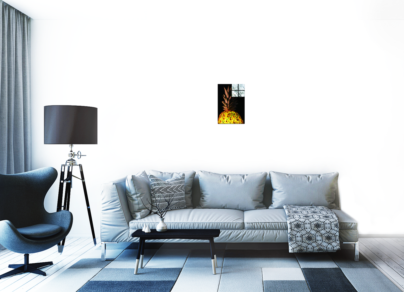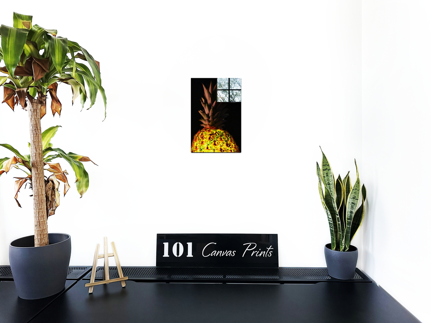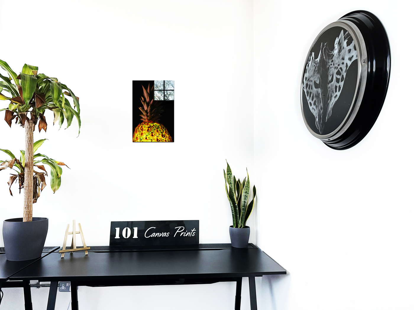 When produced as an acrylic-set print by the skilled 101 Canvas Prints team, this image achieves an even greater level of visual impact. The glossy finish of the Acrylic enhances the pineapple's natural sheen, intensifying its golden glow and creating a striking contrast with the deep, dark background. The result is a piece with a contemporary, almost avant-garde feel that would make a bold statement in a modern kitchen, add a touch of tropical sophistication to a bar area, or serve as an eye-catching focal point in a living room or office. Its unique blend of familiar subject matter and dramatic presentation makes it versatile enough to complement a variety of interior styles, from minimalist to eclectic.
