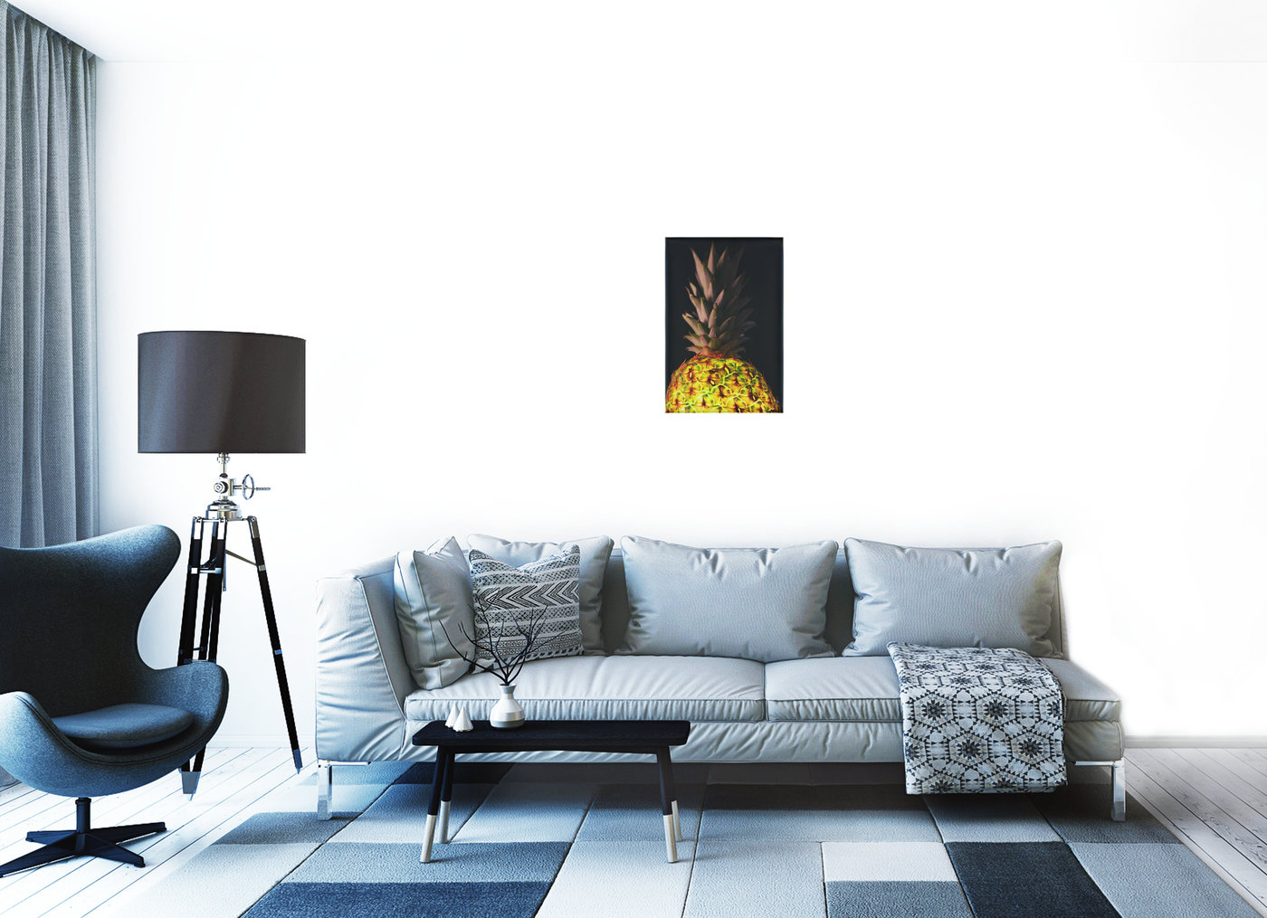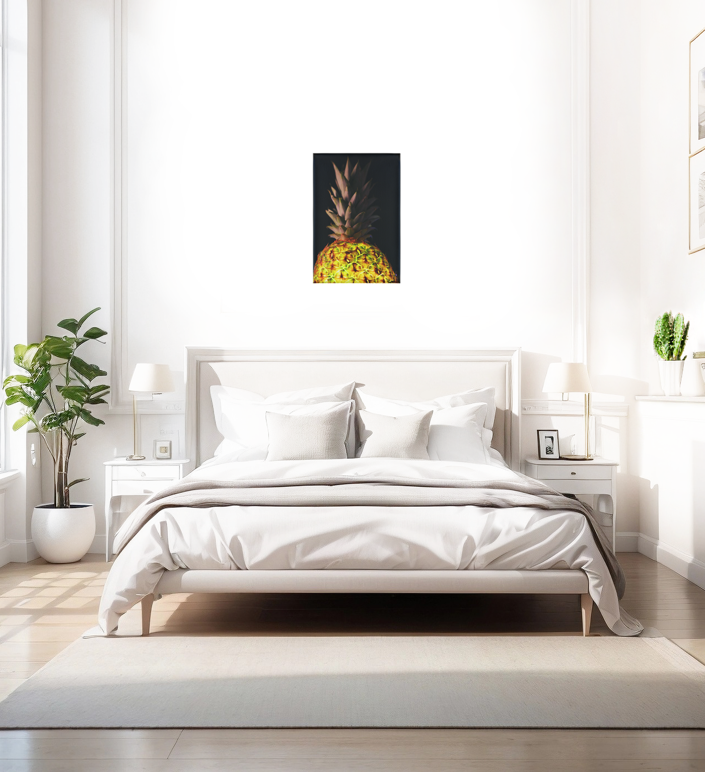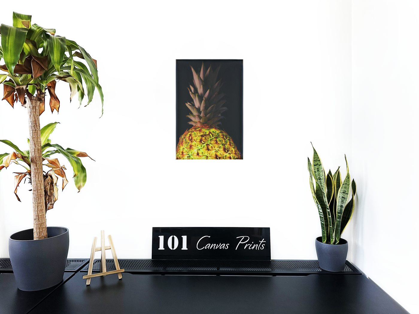 The colour palette is rich and moody, showcasing the fruit in an almost theatrical light. The pineapple's body glows with warm golden yellows and vibrant greens, its intricate pattern of scales beautifully illuminated. This radiant base transitions into the softer, muted golden yellows and greens of the crown, which recedes into the shadows. The 101 Canvas Prints team have masterfully captured the interplay of light and shadow, highlighting the fruit's complex textures and creating a sense of depth and mystery.