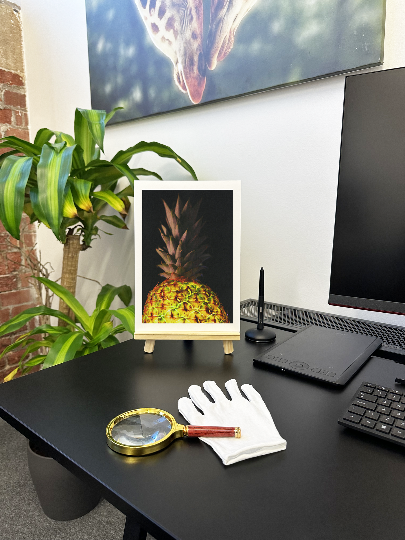 The colour palette is rich and moody, showcasing the fruit in an almost theatrical light. The pineapple's body glows with warm golden yellows and vibrant greens, its intricate pattern of scales beautifully illuminated. This radiant base transitions into the softer, muted yellows and greens of the crown, which recedes into the shadows. The 101 Canvas Prints team have masterfully captured the interplay of light and shadow, highlighting the fruit's complex textures and creating a sense of depth and mystery.