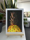 This captivating image, skilfully captured by the 101 Canvas Prints photography team, presents a unique and dramatic view of a pineapple. The composition cleverly frames the lower half and crown of the fruit against a dark background, creating a striking contrast that emphasises the pineapple's distinctive shape and texture.