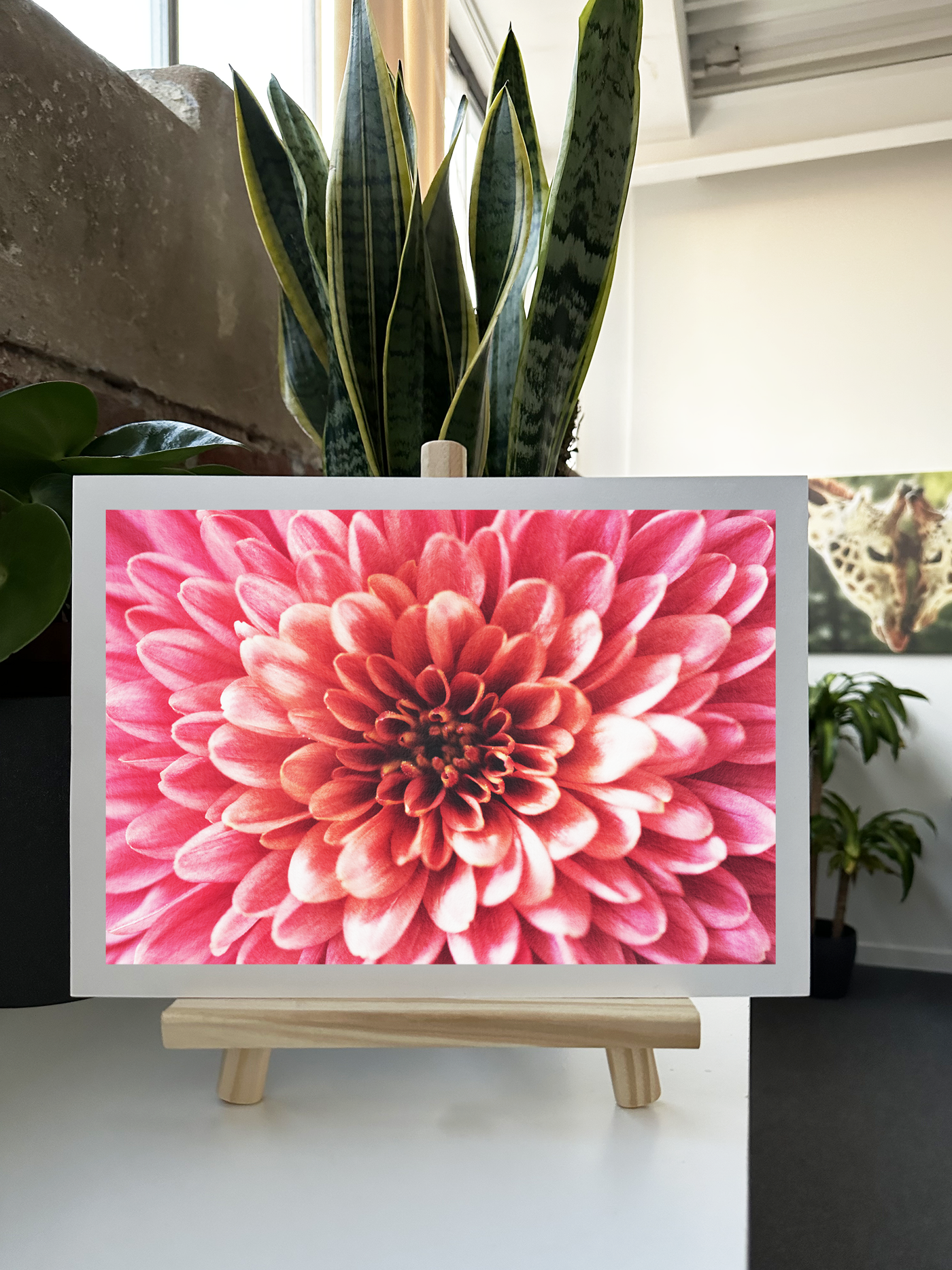 Reproduced on our premium Fine Art paper, this botanical study takes on an additional layer of artistic refinement. The natural, matte finish of the Fine Art paper perfectly complements the flower's velvety texture, while softening the pink tones to create a sophisticated, gallery-quality appearance. This piece would make a stunning addition to any space seeking to combine natural beauty with contemporary artistic vision, from elegant living rooms to upscale spa environments where its serene presence can create an atmosphere of refined tranquillity.