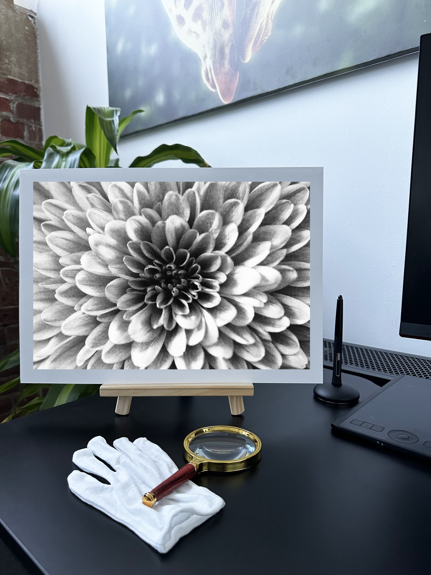 Reproduced on our premium Fine Art paper, this botanical study takes on an additional layer of artistic refinement. The natural, matte finish of the Fine Art paper perfectly complements the flower's velvety texture, while softening the light silver tones to create a sophisticated, gallery-quality appearance. This piece would make a stunning addition to any space seeking to combine natural beauty with contemporary artistic vision, from elegant living rooms to upscale spa environments where its serene presence can create an atmosphere of refined tranquillity.