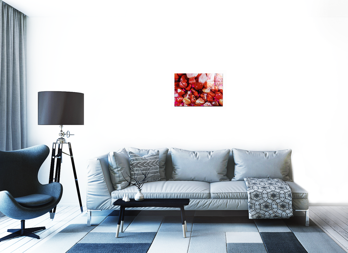 When presented in our premium Acrylic medium, this geological study achieves an extraordinary level of visual impact. The high-gloss finish of the Acrylic perfectly complements the polished surfaces of the stones, while its crystal-clear surface creates an almost three-dimensional effect that enhances their natural depth and luminosity. This stunning piece would be particularly effective in contemporary spaces where its blend of natural elements and modern presentation can create a sophisticated focal point, whether in a private residence or professional environment.
