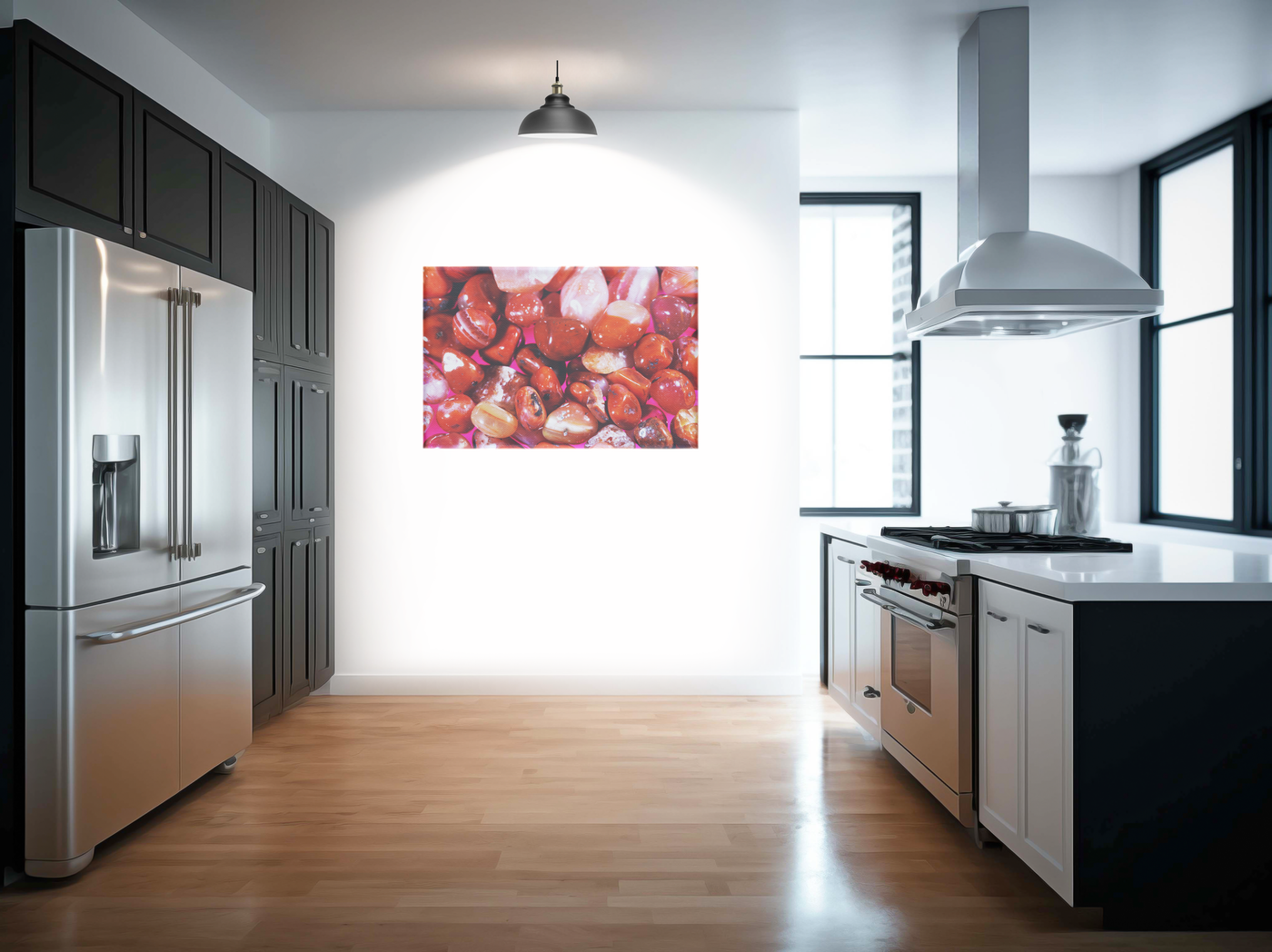 Reproduced on our premium Canvas material, this geological study takes on an additional layer of artistic refinement. The natural, matte finish of the Canvas creates an interesting contrast with the stones' polished surfaces, highlighting their glossy quality while maintaining the image's sophisticated appeal. This piece would make a striking addition to any contemporary space, particularly in areas where its combination of natural elements and modern presentation can create a bridge between organic and designed environments.