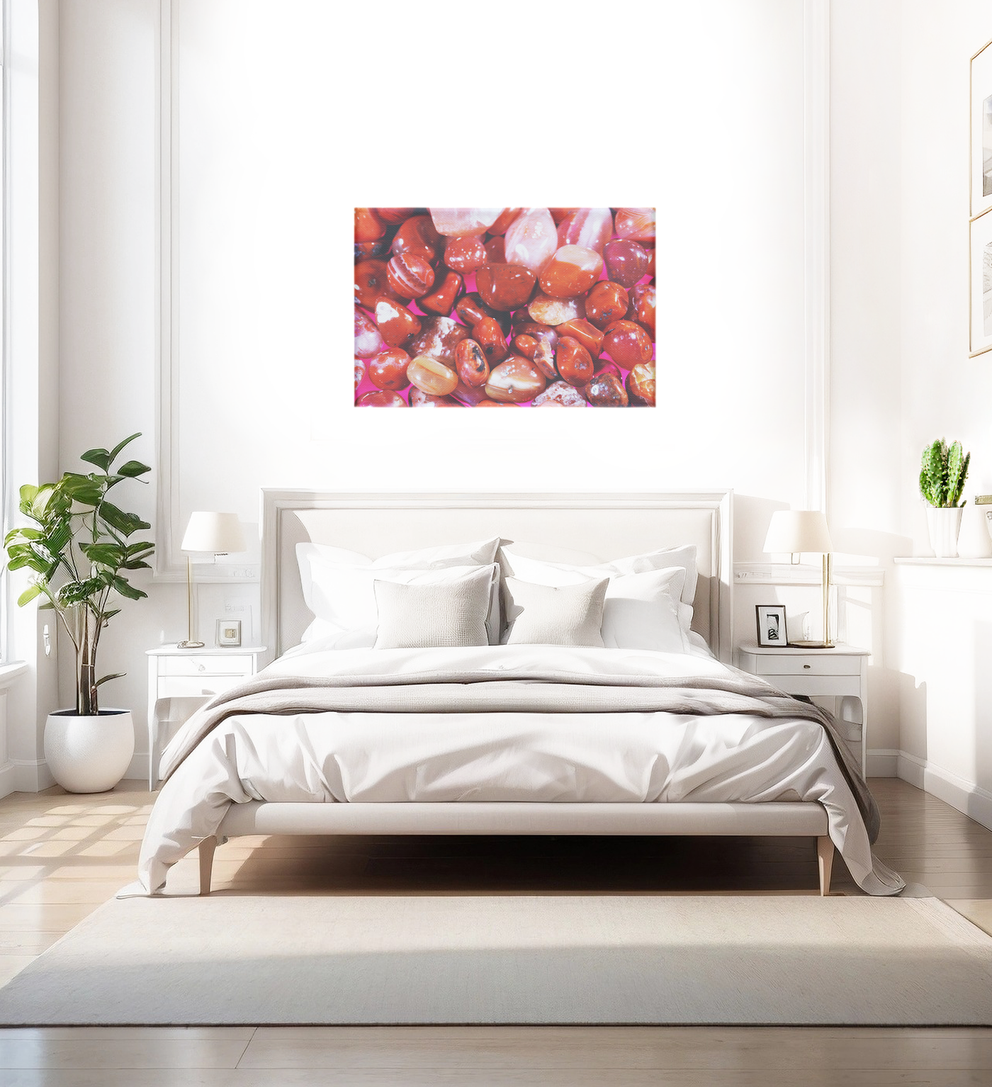 The colour palette celebrates the rich variety found in these minerals, from deep carnelian reds to honey-tinted ambers, with striking white veining and crystalline patterns unique to each stone. Our print enhancement team have preserved every detail of the stones' surface qualities, from their high-polish shine to the intricate internal patterns that make each piece distinct. The interplay between the stones' natural warmth and the bold pink undertone creates a contemporary presentation of these ancient elements.