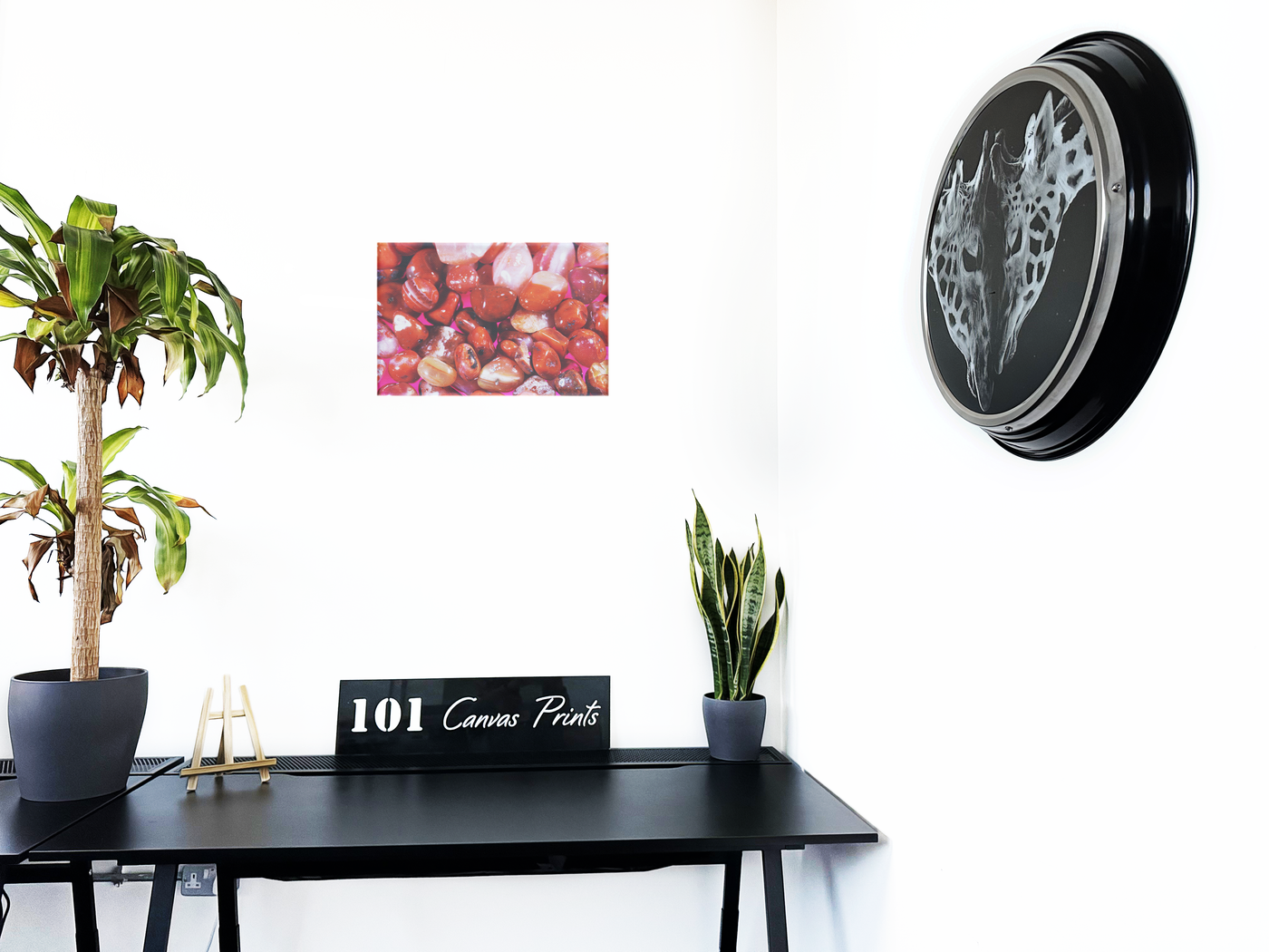 Reproduced on our premium Canvas material, this geological study takes on an additional layer of artistic refinement. The natural, matte finish of the Canvas creates an interesting contrast with the stones' polished surfaces, highlighting their glossy quality while maintaining the image's sophisticated appeal. This piece would make a striking addition to any contemporary space, particularly in areas where its combination of natural elements and modern presentation can create a bridge between organic and designed environments.