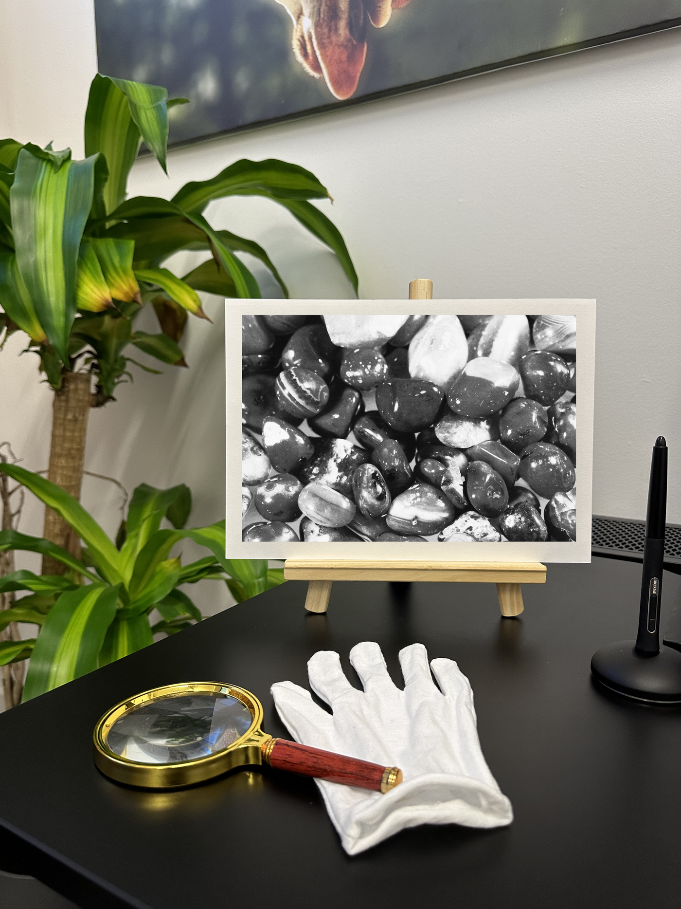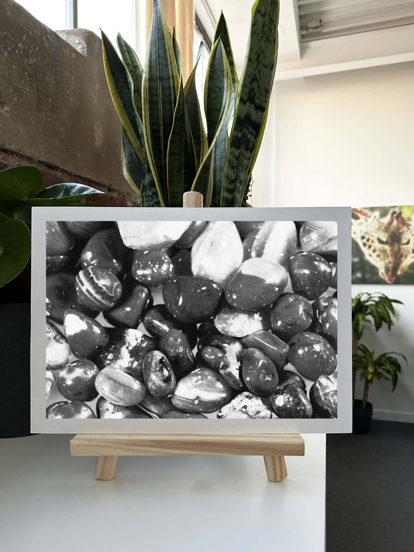 Reproduced on our premium Fine Art paper material, this geological study takes on an additional layer of artistic refinement. The natural, matte finish of the Fine Art paper creates an interesting contrast with the stones' polished surfaces, highlighting their glossy quality while maintaining the image's sophisticated appeal. This piece would make a striking addition to any contemporary space, particularly in areas where its combination of natural elements and modern presentation can create a bridge between organic and designed environments.