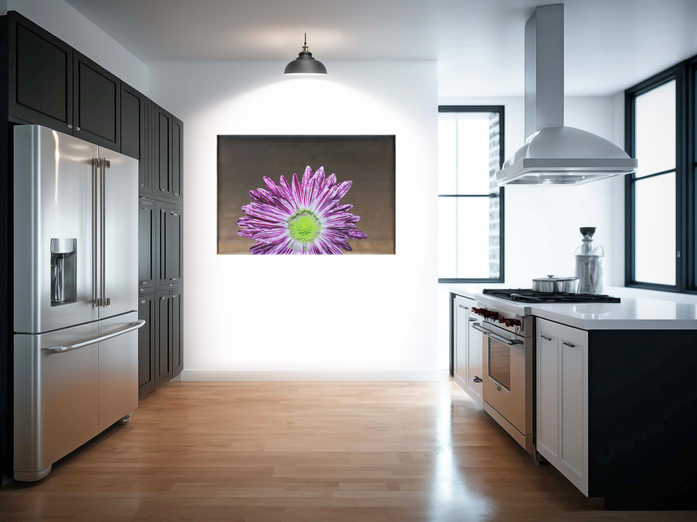 The result is a vibrant and incredibly detailed piece of art which makes the naturally vivid purples and greens of the flower shout for attention, before melting away into a luxurious, chocolatey gradient of brown hues.