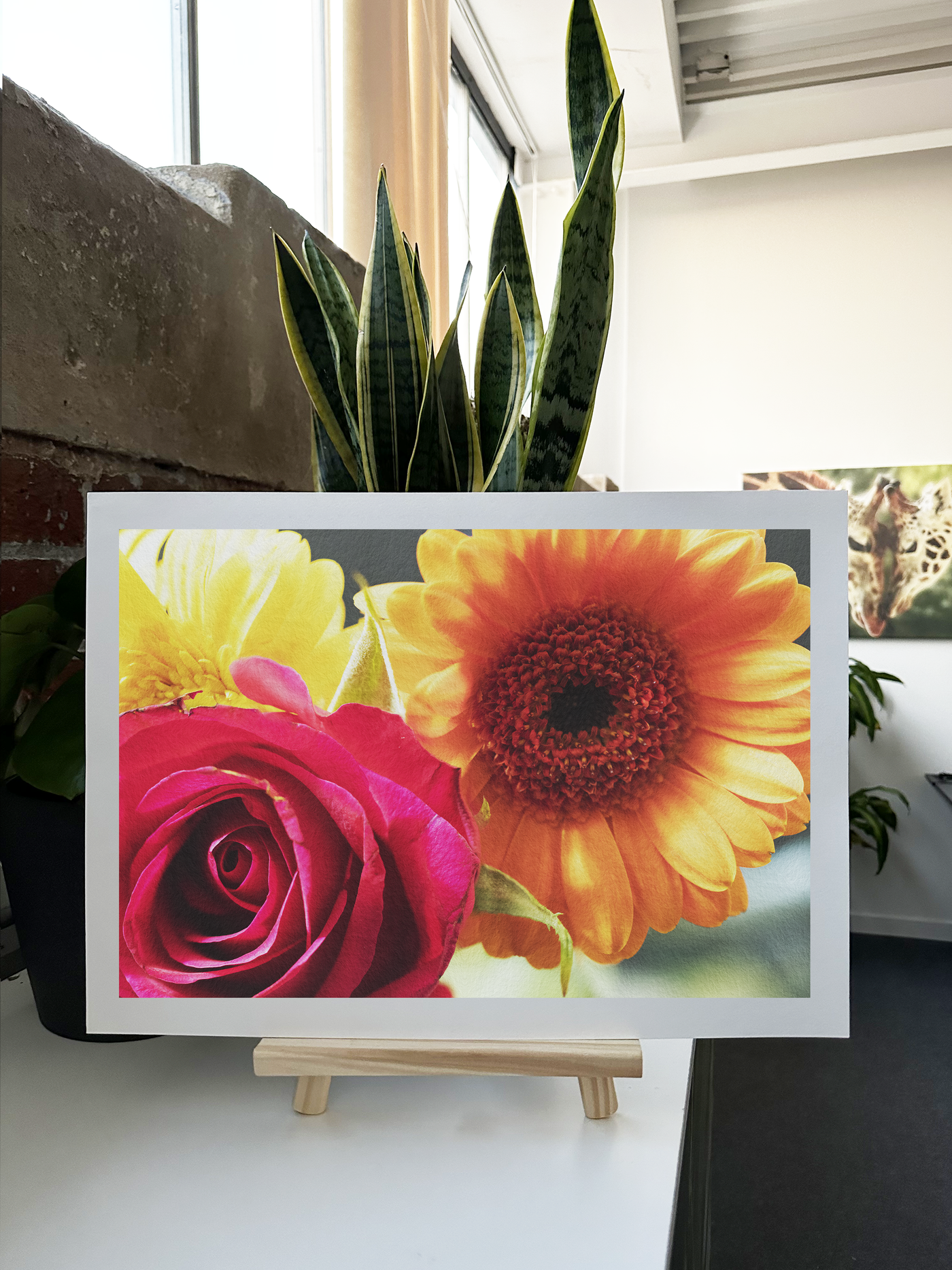 This captivating Fine Art print showcases a stunning close-up of two exquisite flowers: a vivid pink rose and radiant orange & yellow gerbera daisies. The composition is masterfully arranged, with the rose dominating the left foreground and the gerbera taking centre stage on the right. A hint of yellow petals in the background adds depth and intrigue to the scene.