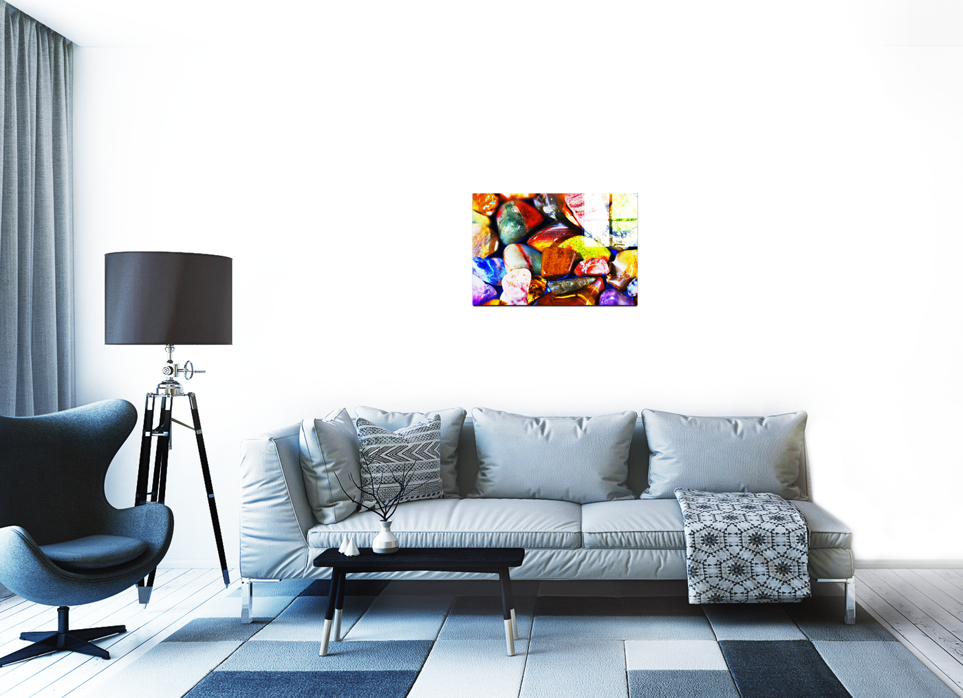 This acrylic-set print transforms a collection of polished stones into a dazzling spectacle of colour and light. The composition presents a close-up view of an assortment of tumbled pebbles, each one a unique geological marvel. The frame is filled with these natural treasures, creating an immersive experience that draws the viewer into a world of mineral beauty.