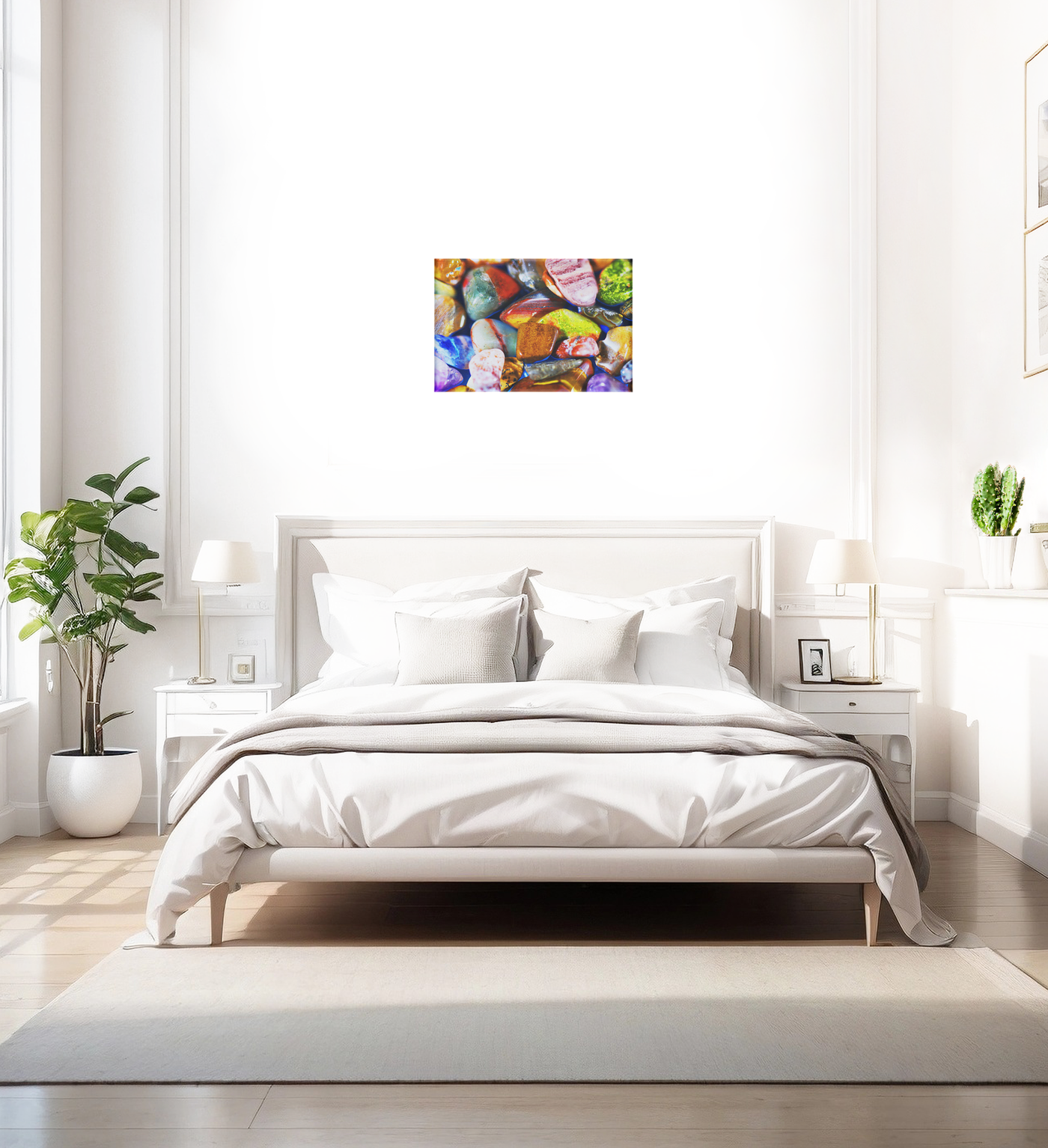 This striking Canvas print offers an intimate view of a diverse collection of polished stones, each one a miniature masterpiece of nature. The composition fills the frame with a vibrant array of pebbles, creating a captivating mosaic of colours, textures, and shapes. From translucent ambers and deep reds to vivid greens and cool blues, the spectrum of hues is truly breathtaking.