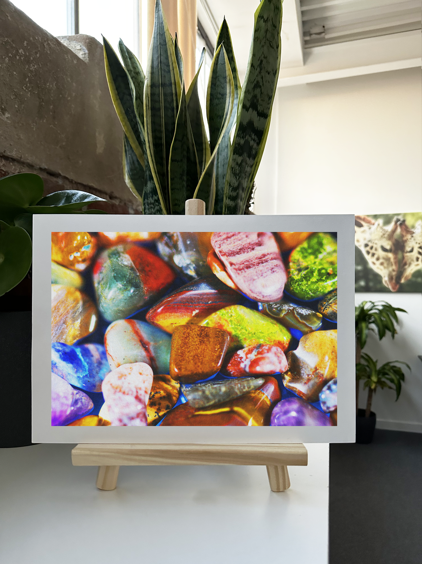 This striking Fine Art print print offers an intimate view of a diverse collection of polished stones, each one a miniature masterpiece of nature. The composition fills the frame with a vibrant array of pebbles, creating a captivating mosaic of colours, textures, and shapes. From translucent ambers and deep reds to vivid greens and cool blues, the spectrum of hues is truly breathtaking.