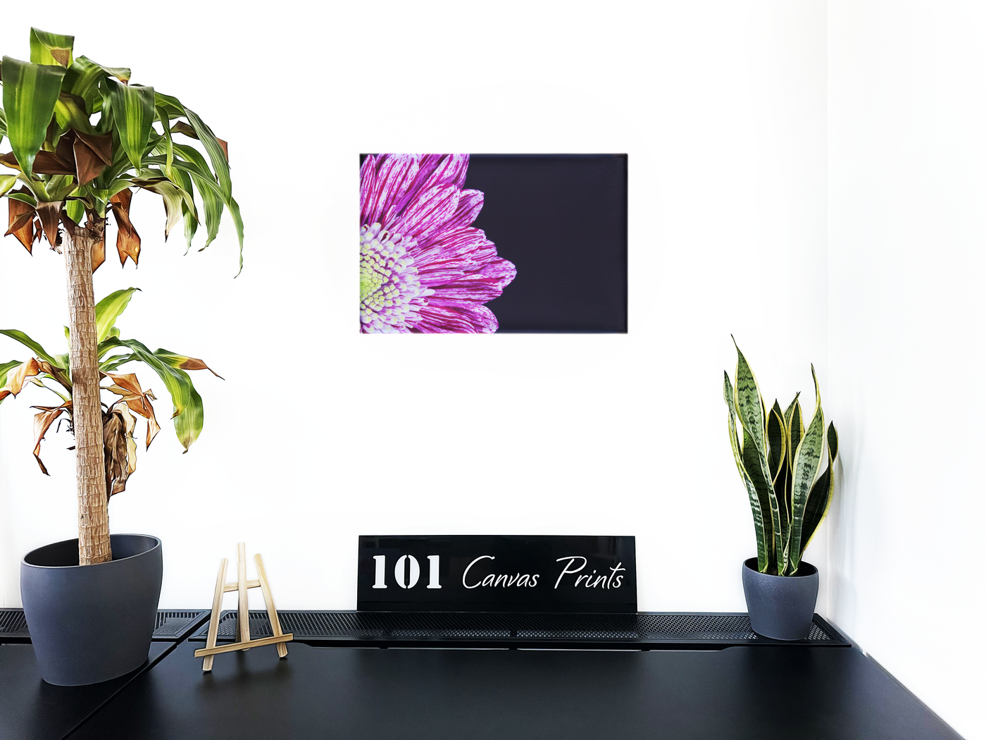 Masterfully captured by the 101 Canvas Prints photography team, this striking macro photograph presents a dramatic study of a Gerbera Daisy in vibrant magenta. The composition creates a bold asymmetrical balance, with the flower's intricate detail filling the left portion of the frame while the dark background adds atmospheric depth to the negative space. The extreme close-up transforms this familiar flower into an exploration of nature's precise architecture and vivid colouration.