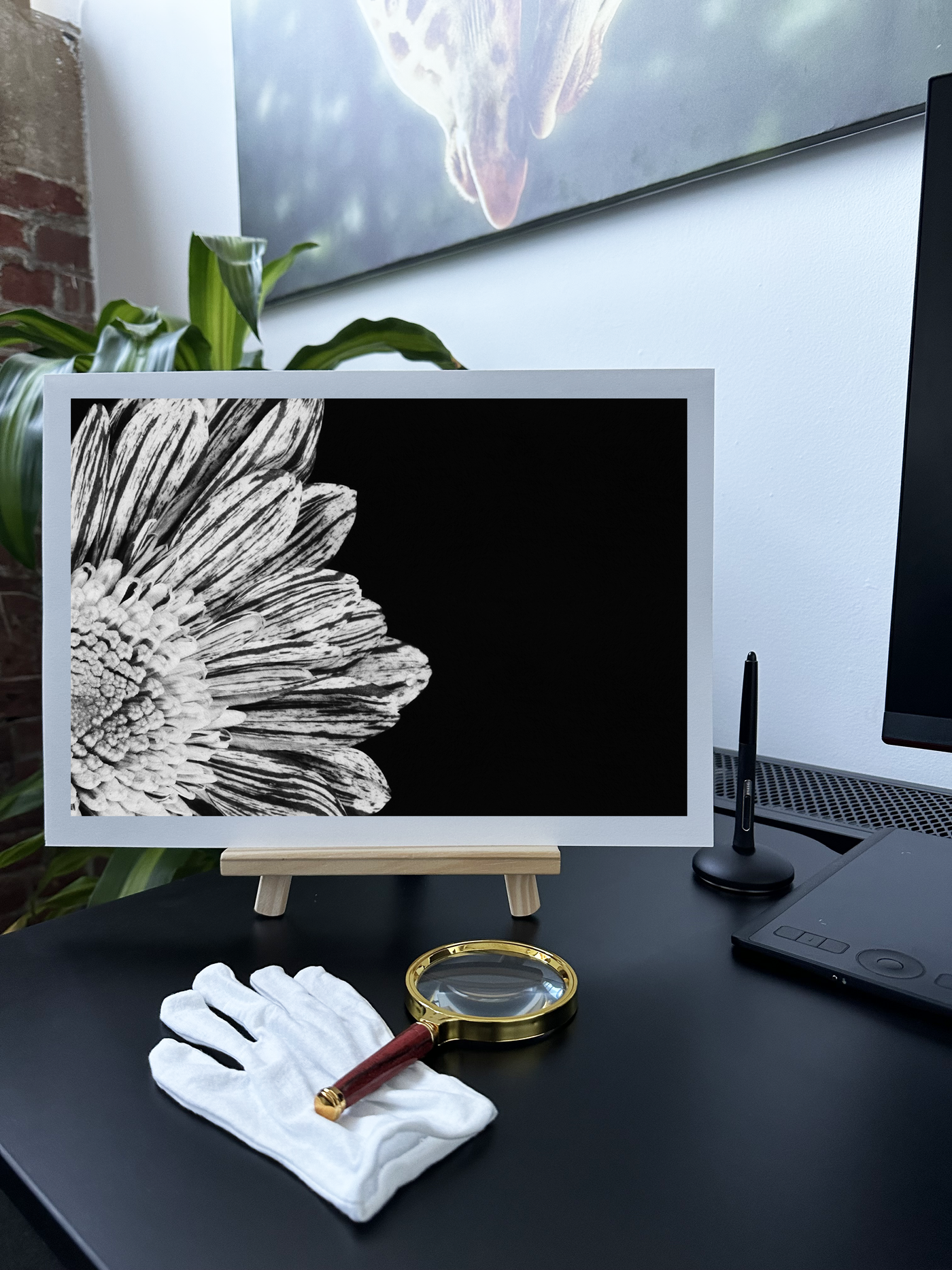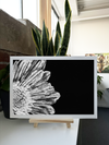 The Monochrome tonal palette is extraordinarily rich, transitioning from deep light petals with delicate striations to a central core of pale silver. Our print enhancement team have carefully preserved every subtle detail, from the fine lines etched into each petal to the perfectly organised pattern of the flower's centre. The contrast between the brilliant flower and the deep black background creates a theatrical effect, while the natural details add an artistic layer of visual intrigue.