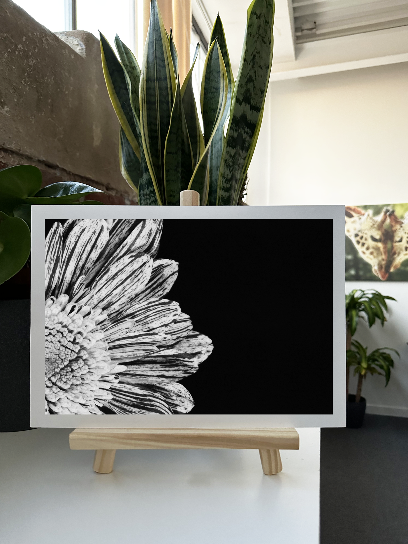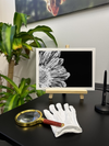 The Monochrome tonal palette is extraordinarily rich, transitioning from deep light petals with delicate striations to a central core of pale silver. Our print enhancement team have carefully preserved every subtle detail, from the fine lines etched into each petal to the perfectly organised pattern of the flower's centre. The contrast between the brilliant flower and the deep black background creates a theatrical effect, while the natural details add an artistic layer of visual intrigue.