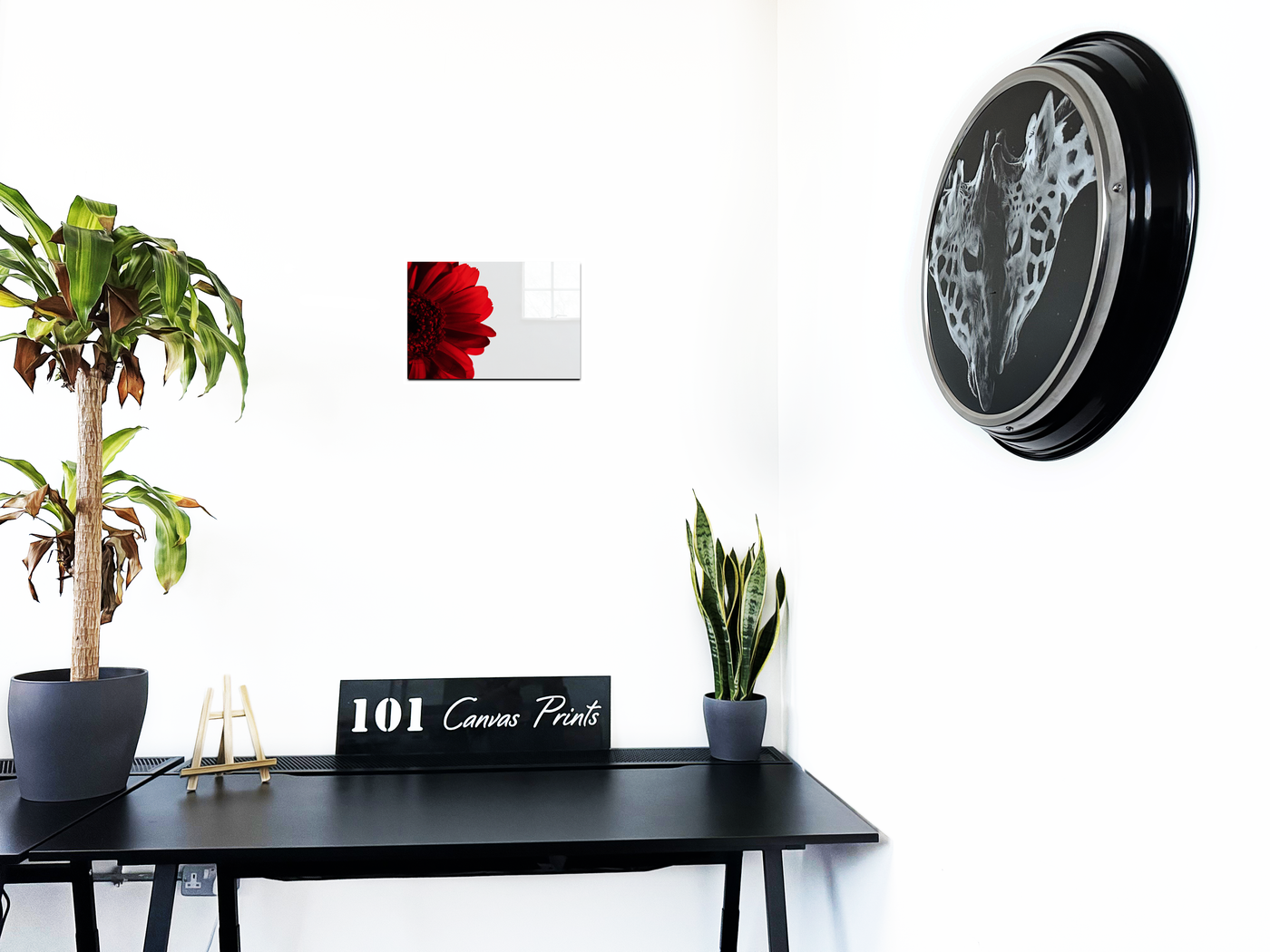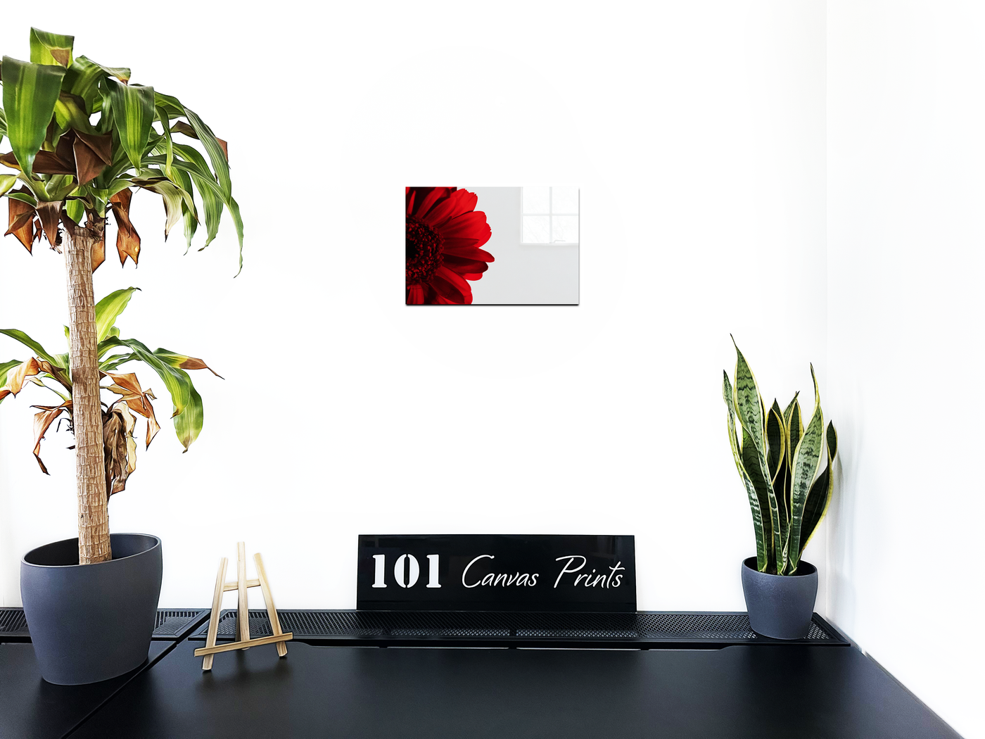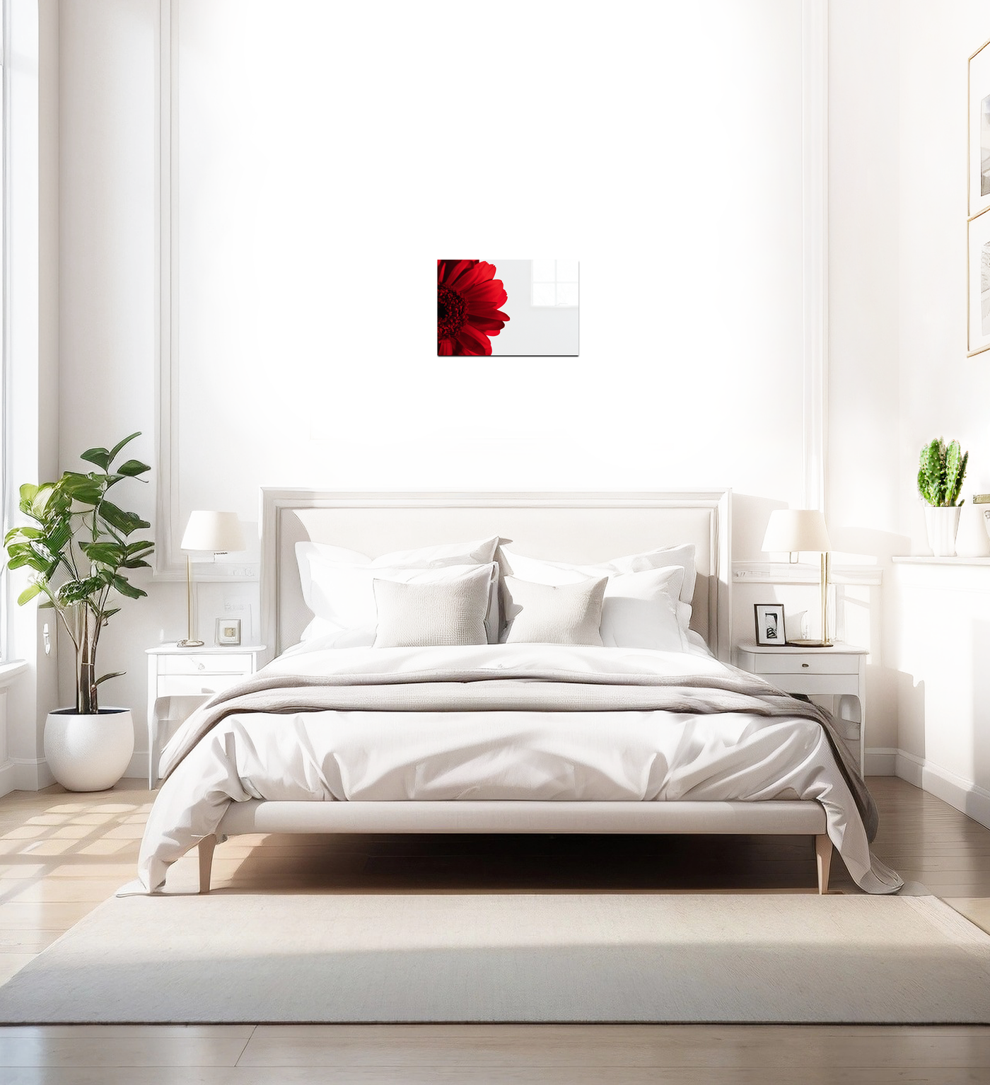This remarkable botanical study, expertly reproduced by the 101 Canvas Prints team, transforms a simple gerbera daisy into a powerful exploration of colour and form. The composition masterfully balances the intense red of the flower against negative space, creating a modern, gallery-worthy image that speaks to both simplicity and sophistication.
