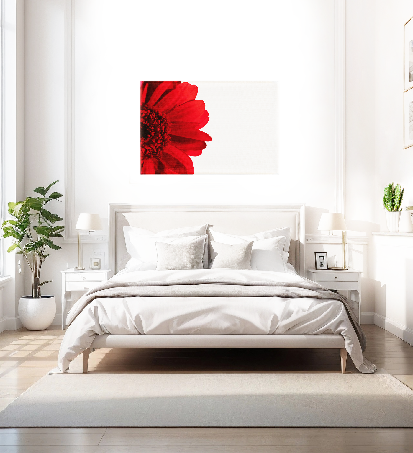 The colour palette is masterfully reduced to its essential elements: rich, velvety crimson tones set against pure white, creating a study in dramatic contrast. Our print enhancement team have preserved every subtle detail of the flower's texture, from the smooth, matte surface of each petal to the complex architecture of its centre. The gradual deepening of the red tones from petal tips to centre creates a sense of depth that draws the viewer into the composition.