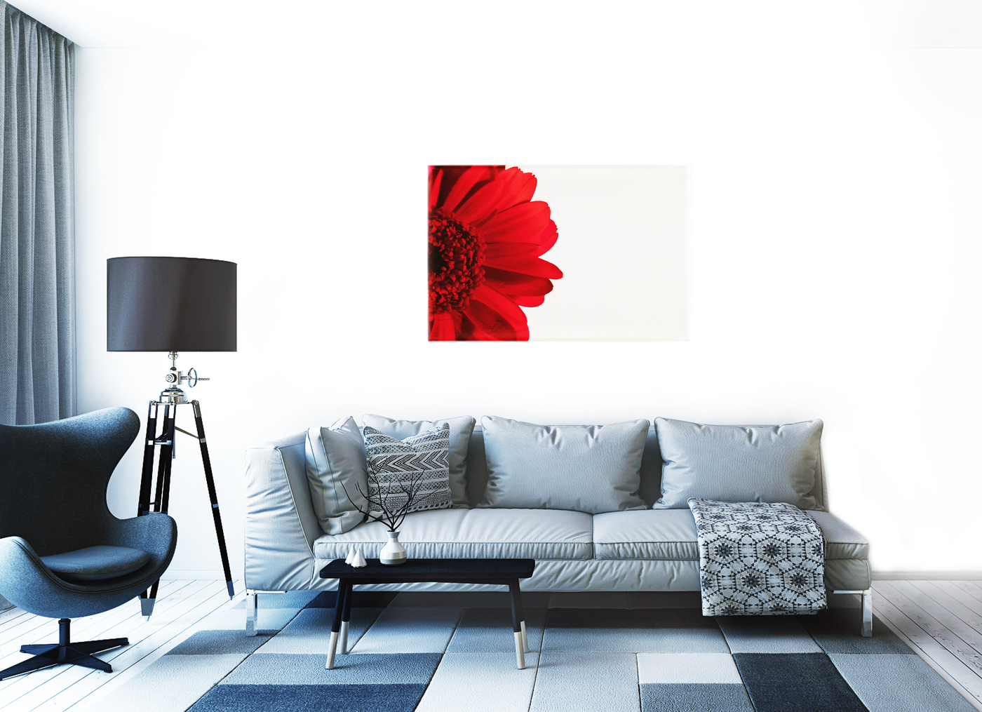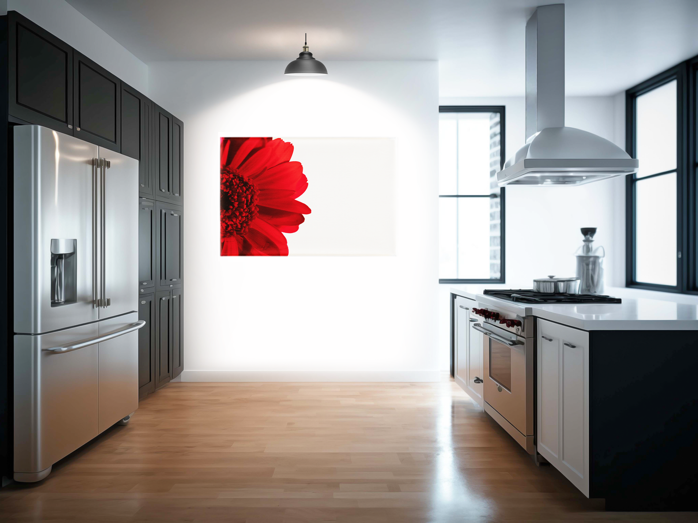 Masterfully captured by the 101 Canvas Prints photography team, this striking composition presents a bold study in contrast, featuring a deep red gerbera daisy against a pristine white background. The photograph focuses on just a portion of the flower, allowing its dramatic red petals and intricate centre to create a powerful asymmetrical composition.