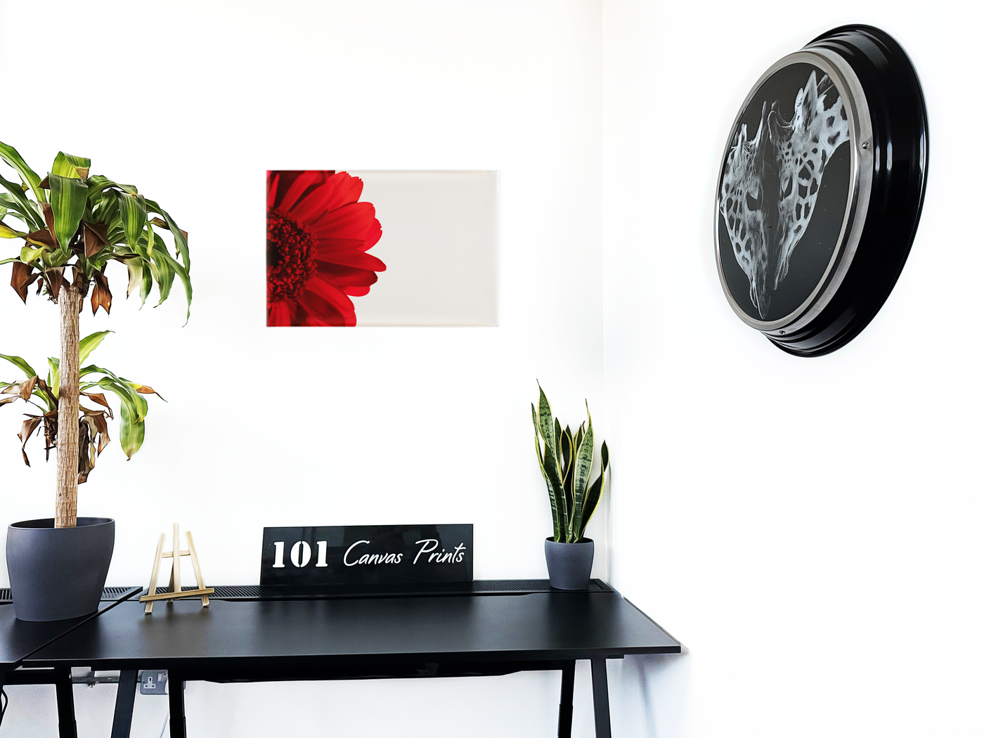Reproduced on our premium Canvas material, this botanical portrait takes on an additional layer of artistic sophistication. The natural, matte finish of the Canvas perfectly complements the flower's velvet-like texture while providing a beautiful contrast to the crisp white background. This piece would make a striking statement in any contemporary space, from a modern living room to a professional office, where its bold simplicity and dramatic impact can command attention while maintaining an air of elegant restraint.