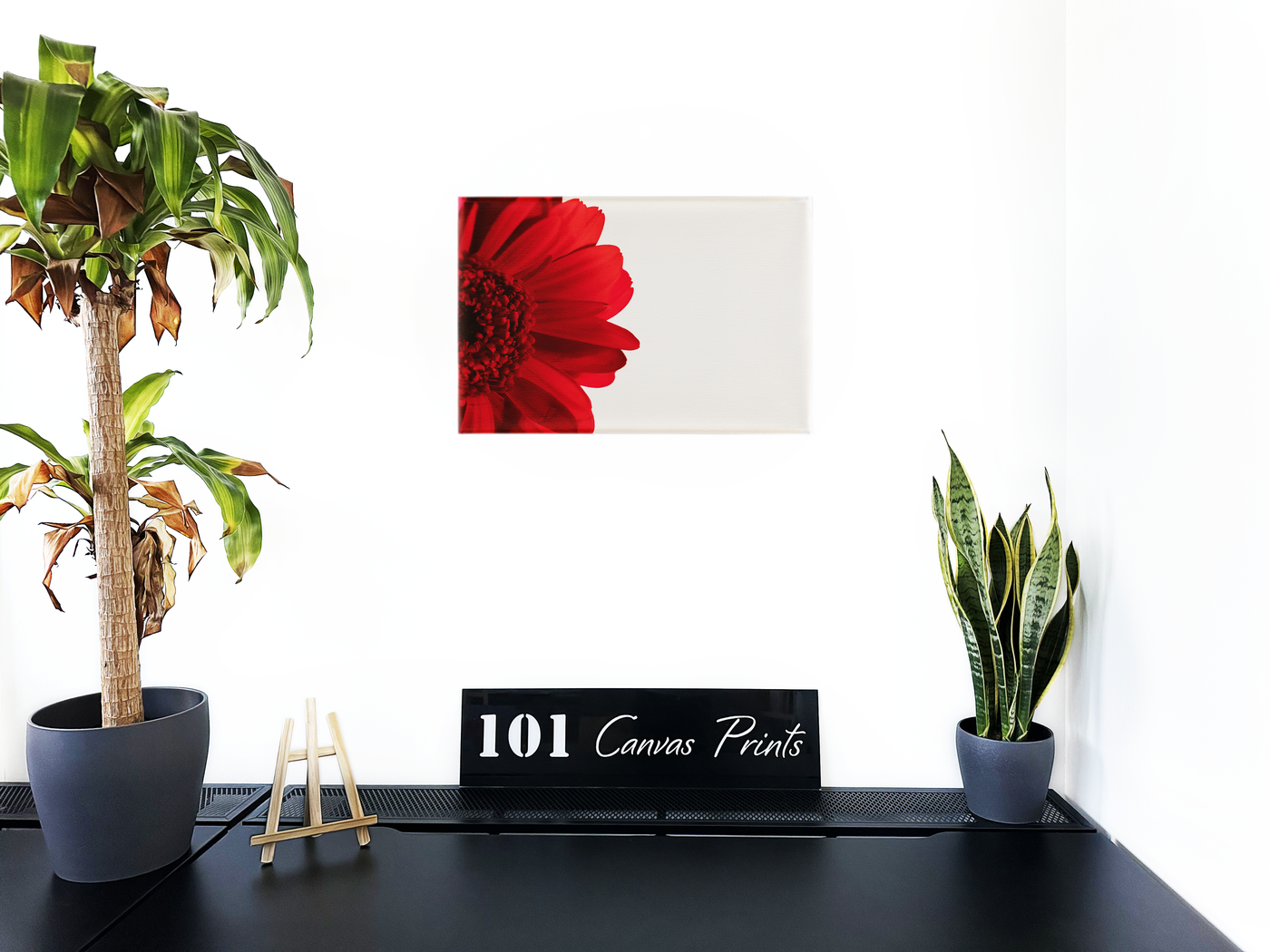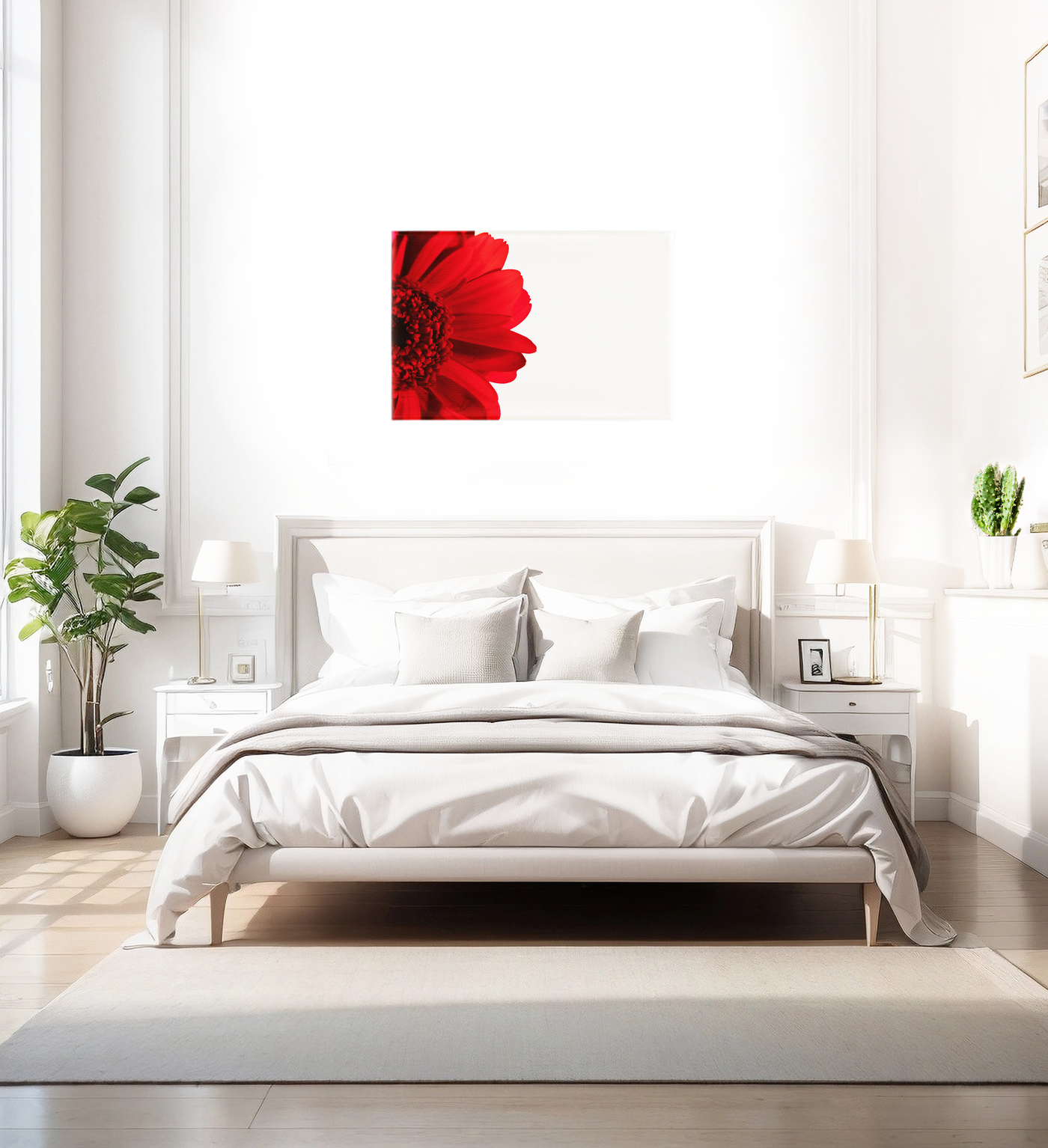Masterfully captured by the 101 Canvas Prints photography team, this striking composition presents a bold study in contrast, featuring a deep red gerbera daisy against a pristine white background. The photograph focuses on just a portion of the flower, allowing its dramatic red petals and intricate centre to create a powerful asymmetrical composition.