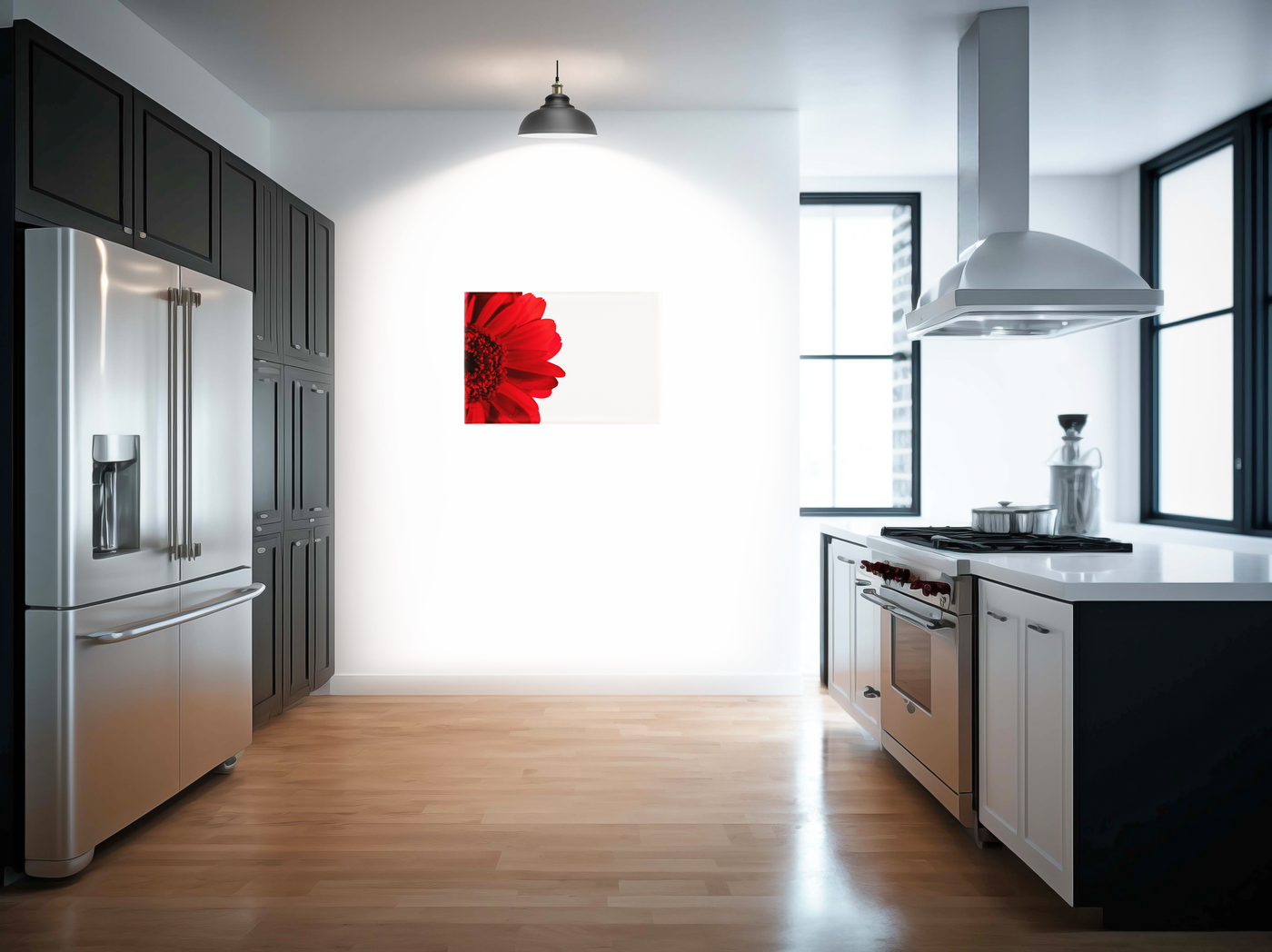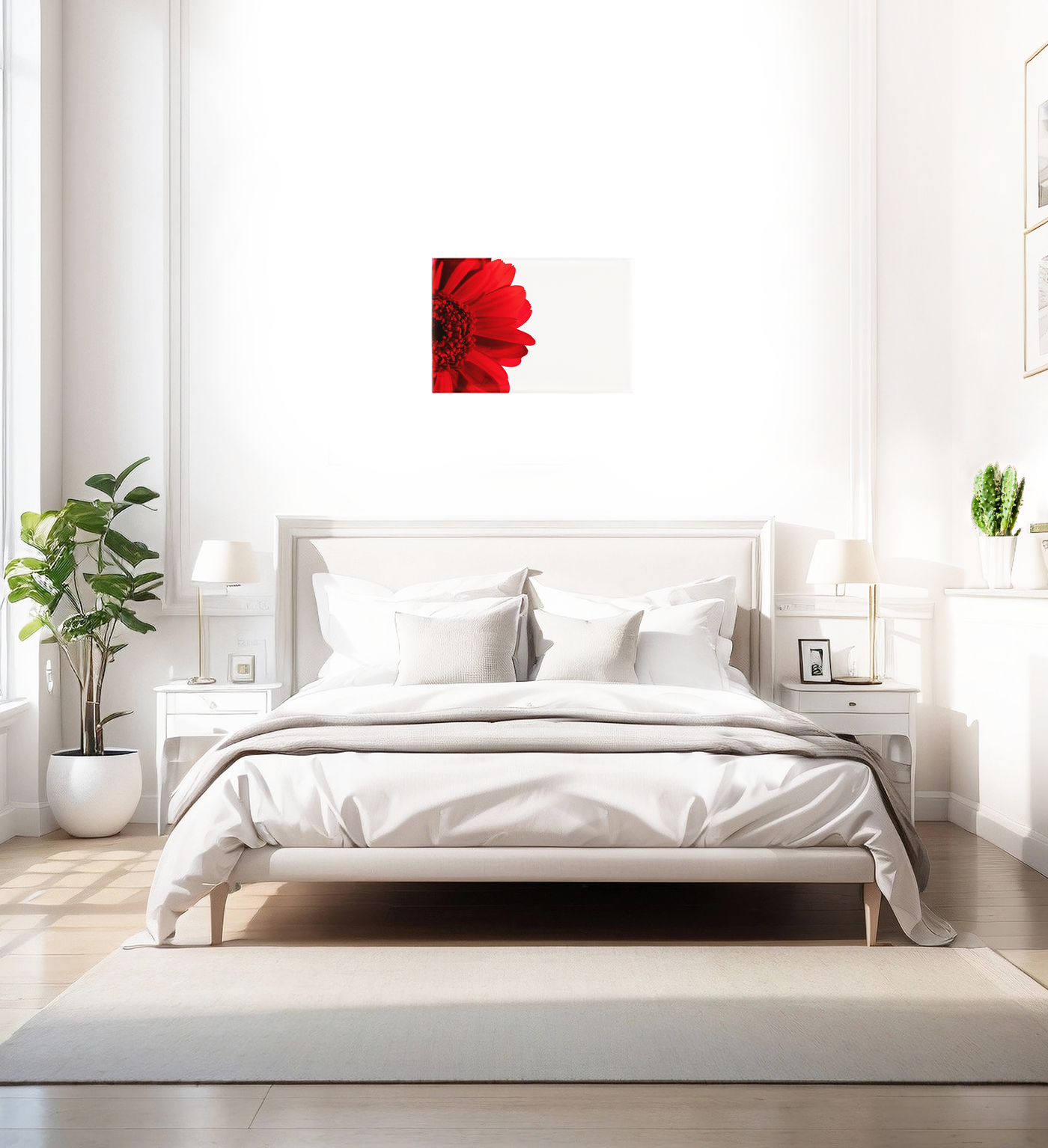 The colour palette is masterfully reduced to its essential elements: rich, velvety crimson tones set against pure white, creating a study in dramatic contrast. Our print enhancement team have preserved every subtle detail of the flower's texture, from the smooth, matte surface of each petal to the complex architecture of its centre. The gradual deepening of the red tones from petal tips to centre creates a sense of depth that draws the viewer into the composition.