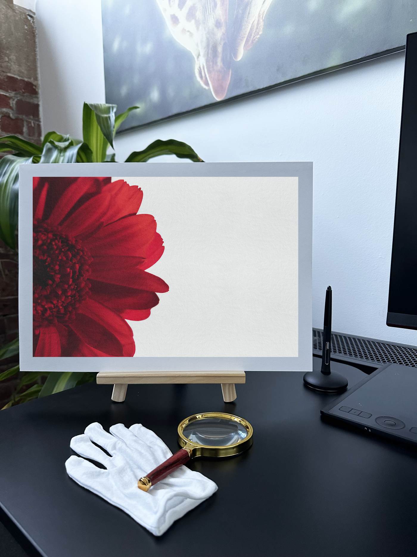 Reproduced on our premium Fine Art paper, this botanical portrait takes on an additional layer of artistic sophistication. The natural, matte finish of the Fine Art print perfectly complements the flower's velvet-like texture while providing a beautiful contrast to the crisp white background. This piece would make a striking statement in any contemporary space, from a modern living room to a professional office, where its bold simplicity and dramatic impact can command attention while maintaining an air of elegant restraint.