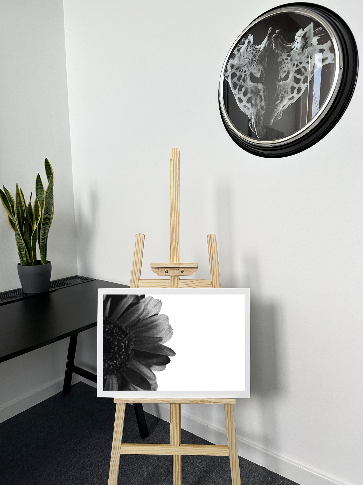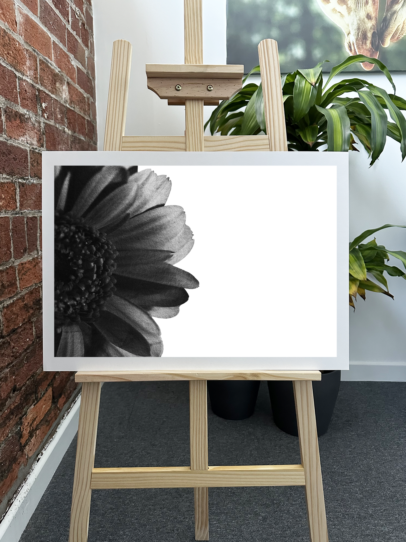 The Monochrome palette is masterfully reduced to its essential elements: rich, velvety light silver hues set against pure white, creating a study in dramatic contrast. Our print enhancement team have preserved every subtle detail of the flower's texture, from the smooth, matte surface of each petal to the complex architecture of its centre. The gradual deepening of the Monochrome tones from petal tips to centre creates a sense of depth that draws the viewer into the composition.
