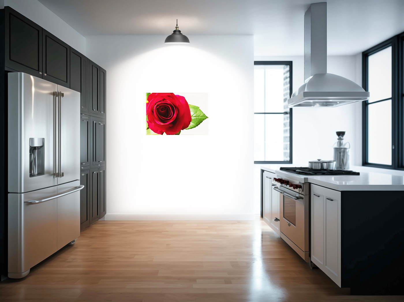 The colour palette is perfectly balanced between the rose's rich crimson petals, which show subtle variations from deep red to bright magenta, and the fresh spring green of its leaves. Our print enhancement team have carefully preserved every nuance of the flower's natural texture, from the velvet-like surface of each petal to the delicate veining in the leaves. The white background provides a pure Canvas that allows these colours to command full attention while maintaining an air of sophisticated simplicity.