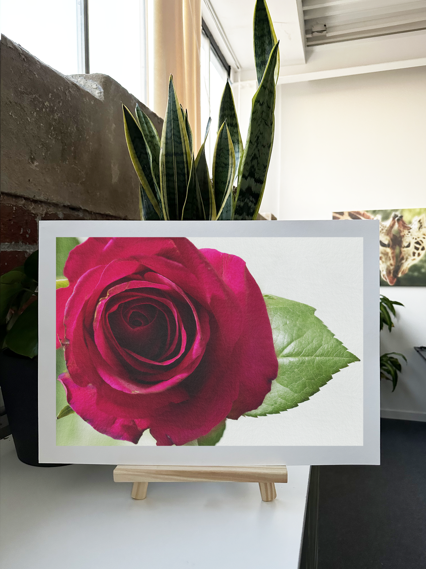 The colour palette is perfectly balanced between the rose's rich crimson petals, which show subtle variations from deep red to bright magenta, and the fresh spring green of its leaves. Our print enhancement team have carefully preserved every nuance of the flower's natural texture, from the velvet-like surface of each petal to the delicate veining in the leaves. The white background provides a pure Fine art print that allows these colours to command full attention while maintaining an air of sophisticated simplicity.