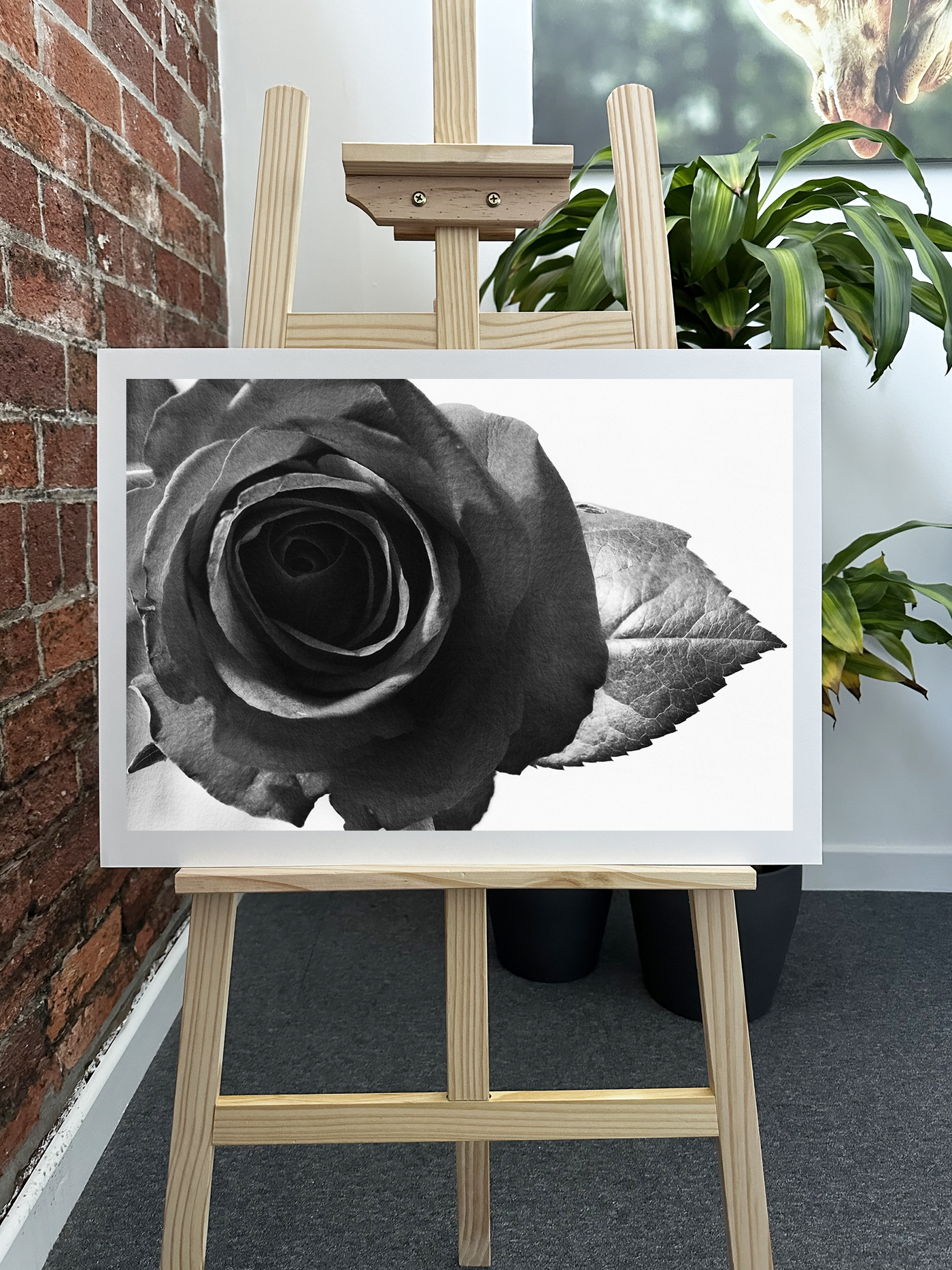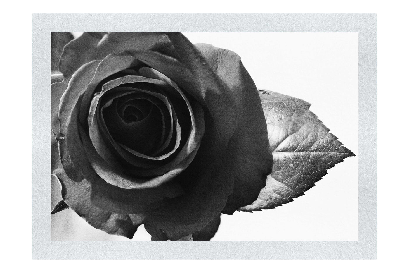 The Monochrome palette is perfectly balanced between the rose's rich textured petals, which show subtle variations from light to dark tonal hues in the leaves. Our print enhancement team have carefully preserved every nuance of the flower's natural texture, from the velvet-like surface of each petal to the delicate veining in the leaves. The white background provides a pure Fine art print that allows these Monochromatic tones to command full attention while maintaining an air of sophisticated simplicity.