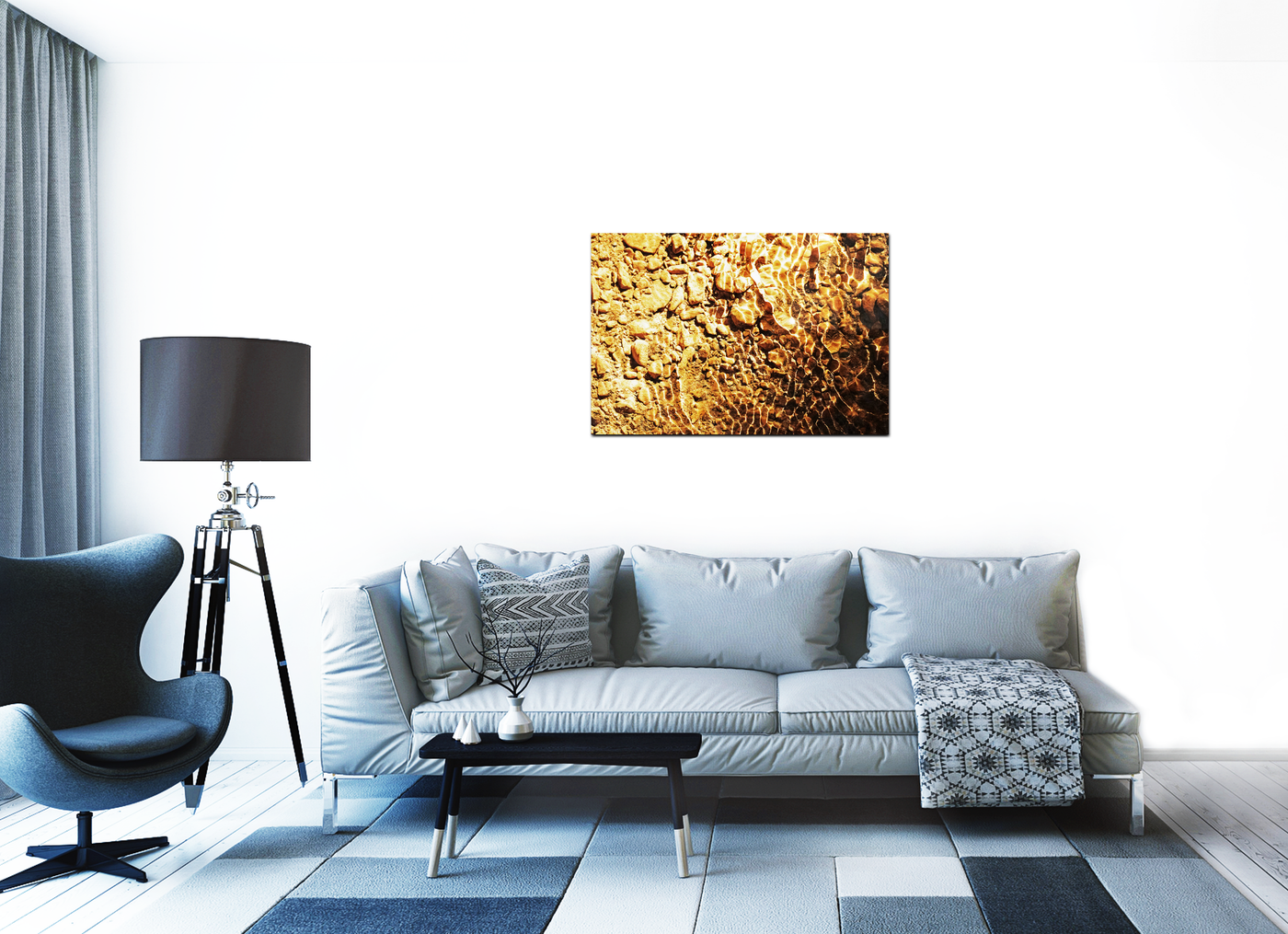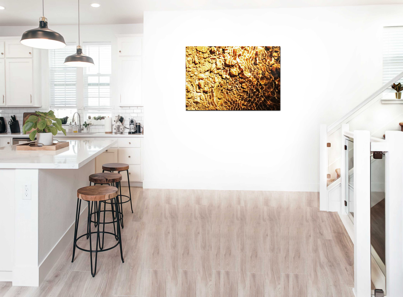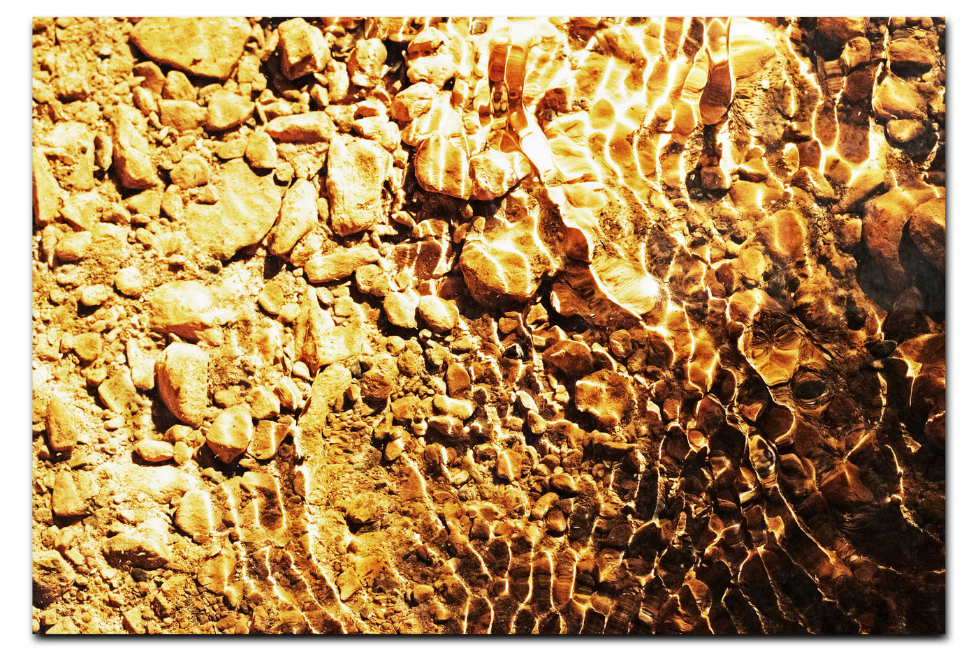 When presented in our premium Acrylic medium, this study achieves an extraordinary level of visual impact. The high-gloss finish dramatically enhances the liquid quality of the image, while the crystal-clear surface creates an almost three-dimensional effect that brings new life to the water's movement. The way light interacts with our Acrylic prints adds an extra dimension to the viewing experience, making the golden patterns appear to shift and change as viewing angles change. This stunning piece would be particularly effective in modern interiors where its warm tones and abstract patterns can create maximum impact, perfect for spaces ranging from luxury hotels to contemporary homes seeking to bring natural elegance to their environment.