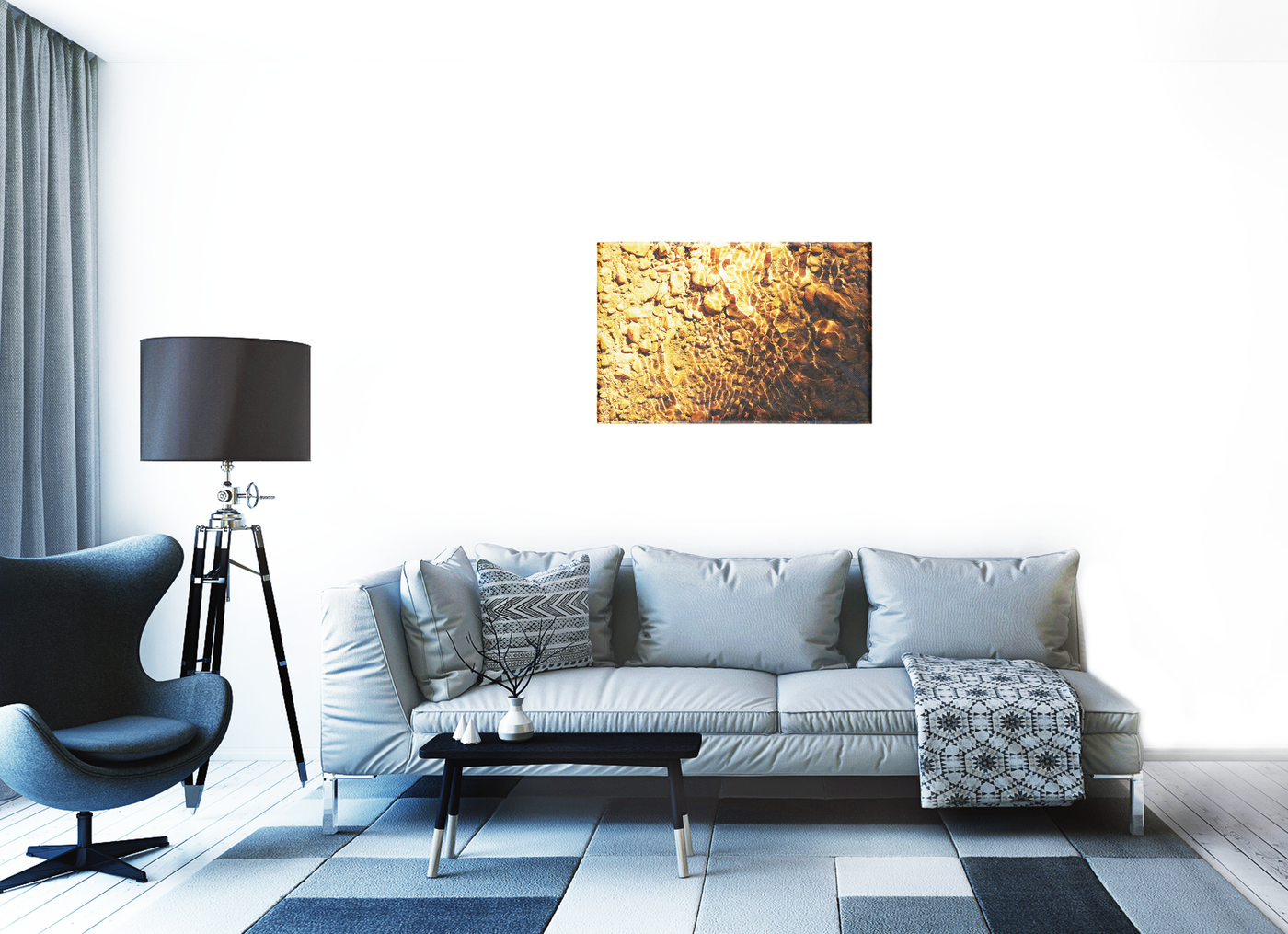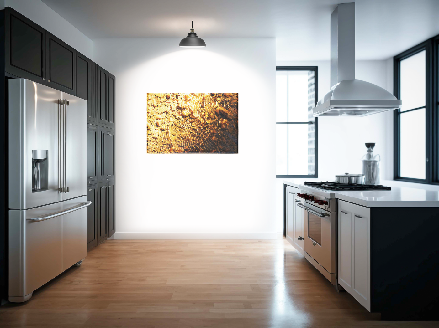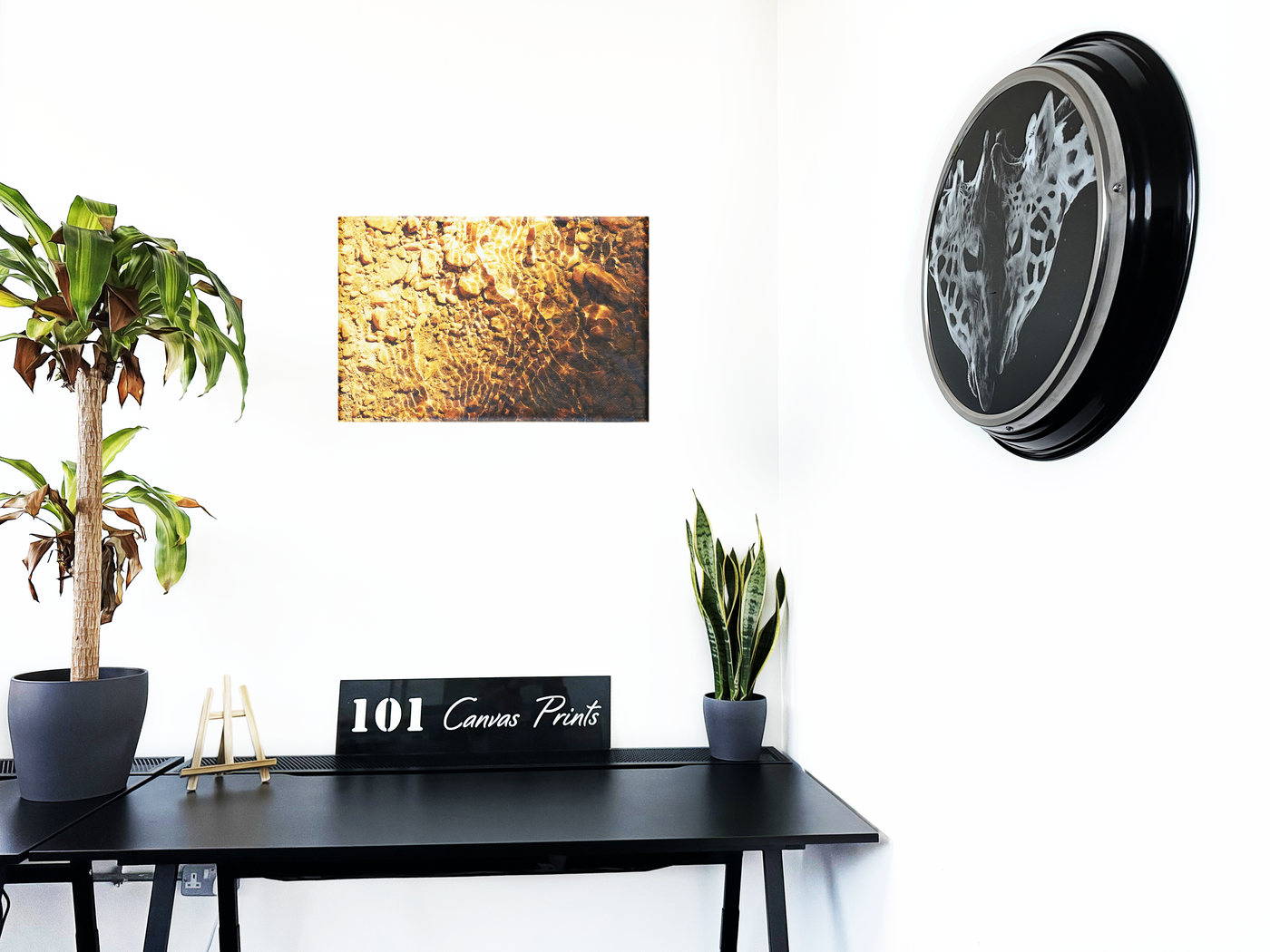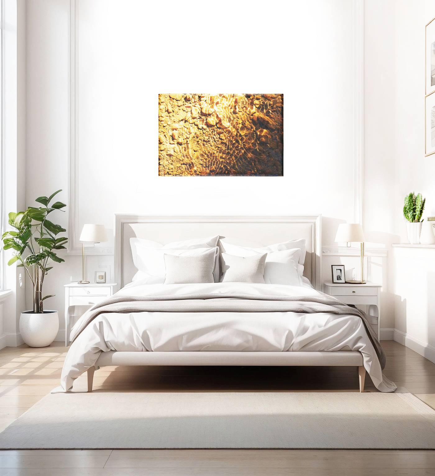 Reproduced on our premium Canvas material, this abstract study takes on an additional layer of artistic refinement. The natural, matte finish of the Canvas provides an interesting contrast to the liquid nature of the subject matter, while maintaining the photograph's rich golden tones and intricate detail. This piece would make a striking addition to any contemporary space, particularly in areas where its warm tones and organic patterns can create an atmosphere of natural luxury and sophisticated calm.