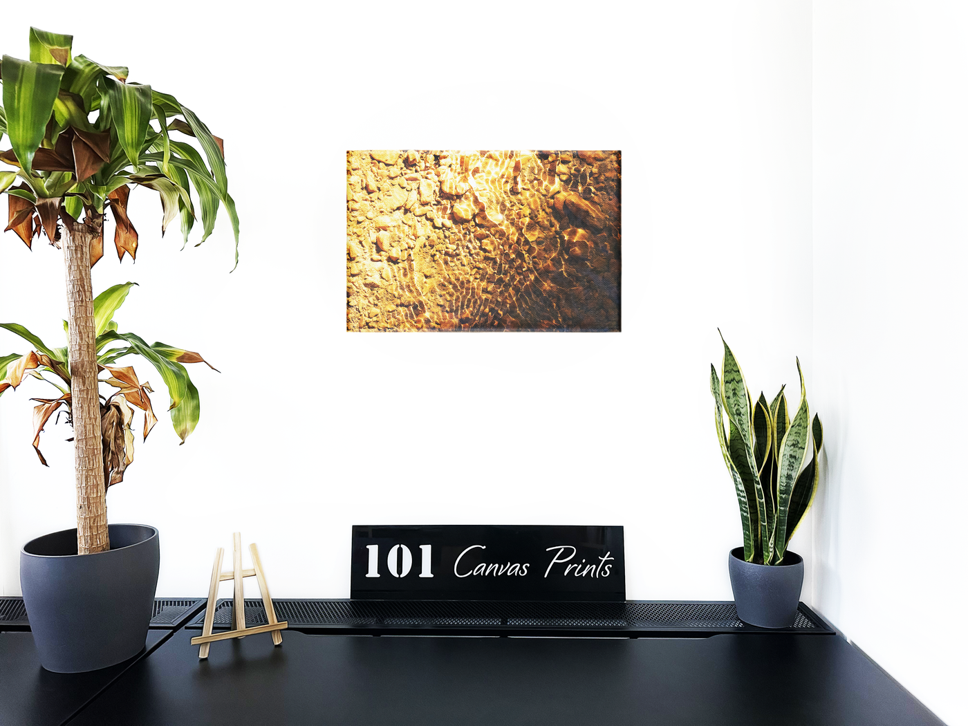 Masterfully captured by the 101 Canvas Prints photography team, this mesmerising abstract study presents the interplay of light and water in stunning detail. The image captures the magical moment when sunlight dances across rippling water, creating a natural pattern that resembles molten gold. The composition transitions from textured, granular forms to fluid, wave-like patterns, creating a fascinating study of nature's ability to transform ordinary elements into extraordinary visual poetry.