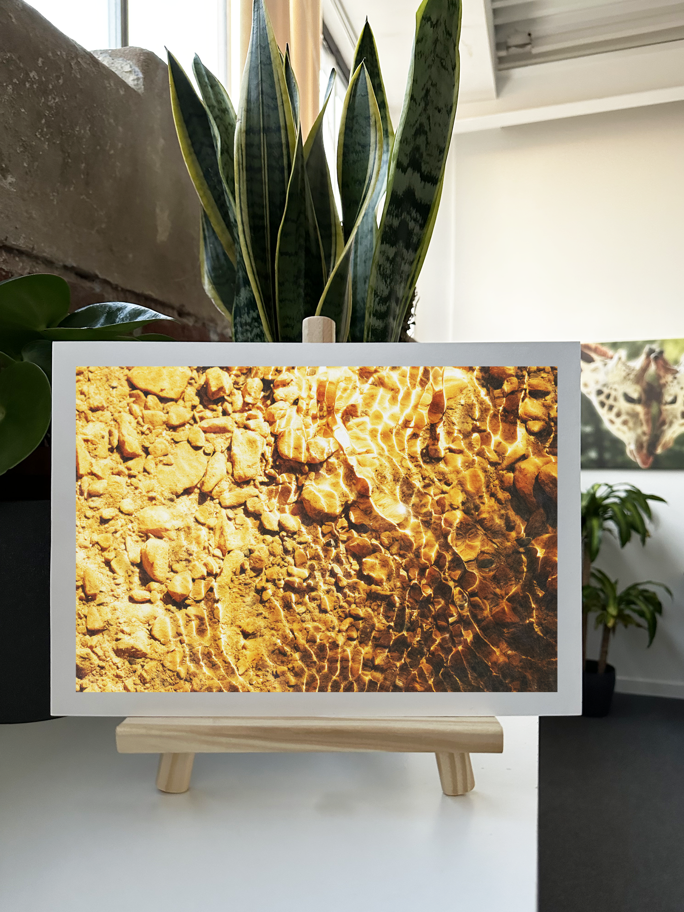 The colour palette explores the rich spectrum of amber and gold tones, from bright, almost crystalline highlights to deep, bronzed shadows. Our print enhancement team have carefully preserved every nuance of light and texture, from the intricate ripple patterns to the grainy, sand-like textures that add depth and complexity to the composition. The gradual shift from light to shadow across the frame creates a natural sense of movement and depth.