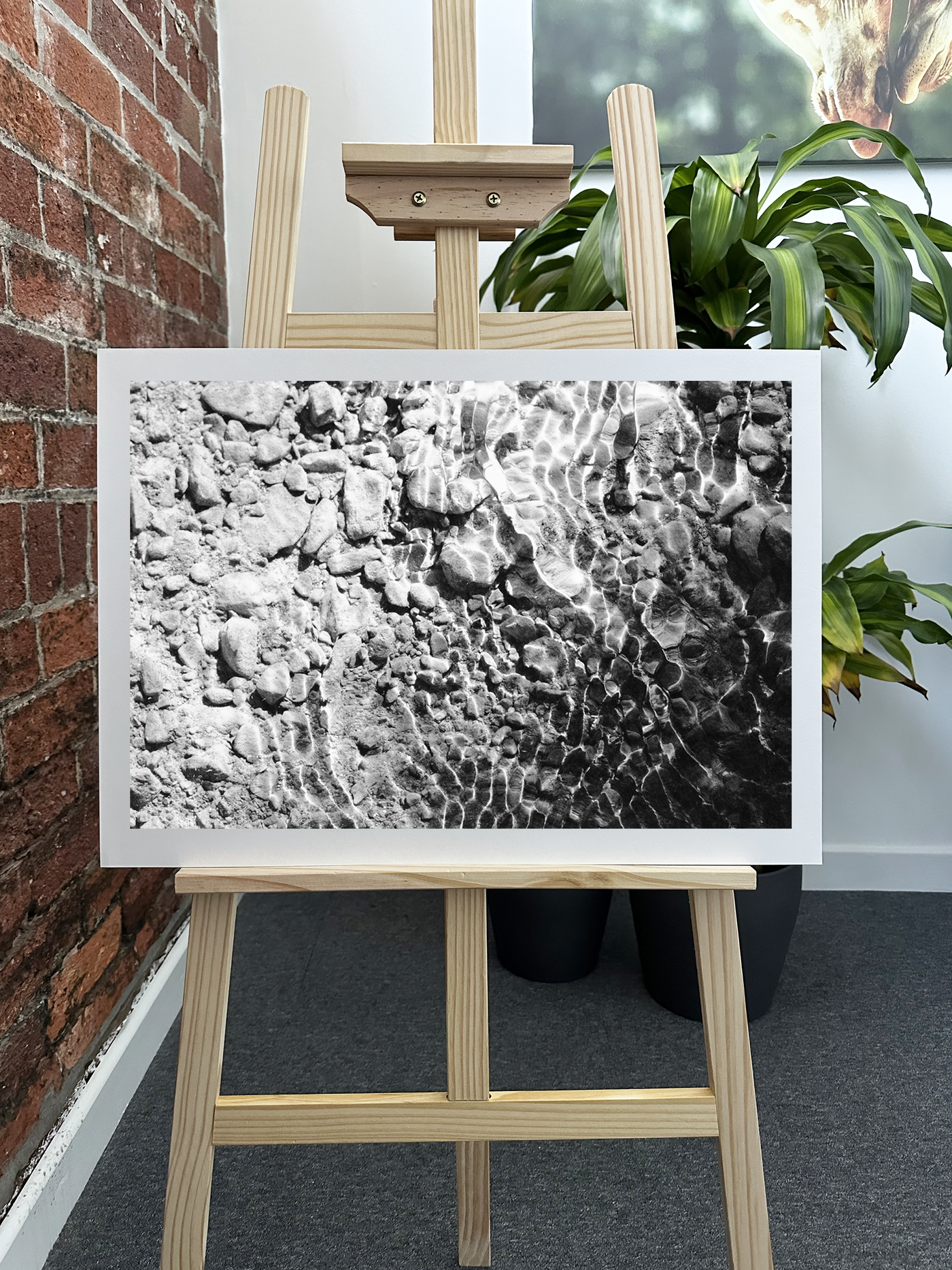 The Monochrome palette explores the rich spectrum of light & dark tones, from bright, almost crystalline highlights to deep, black shadows. Our print enhancement team have carefully preserved every nuance of light and texture, from the intricate ripple patterns to the grainy, sand-like textures that add depth and complexity to the composition. The gradual shift from light to shadow across the frame creates a natural sense of movement and depth.