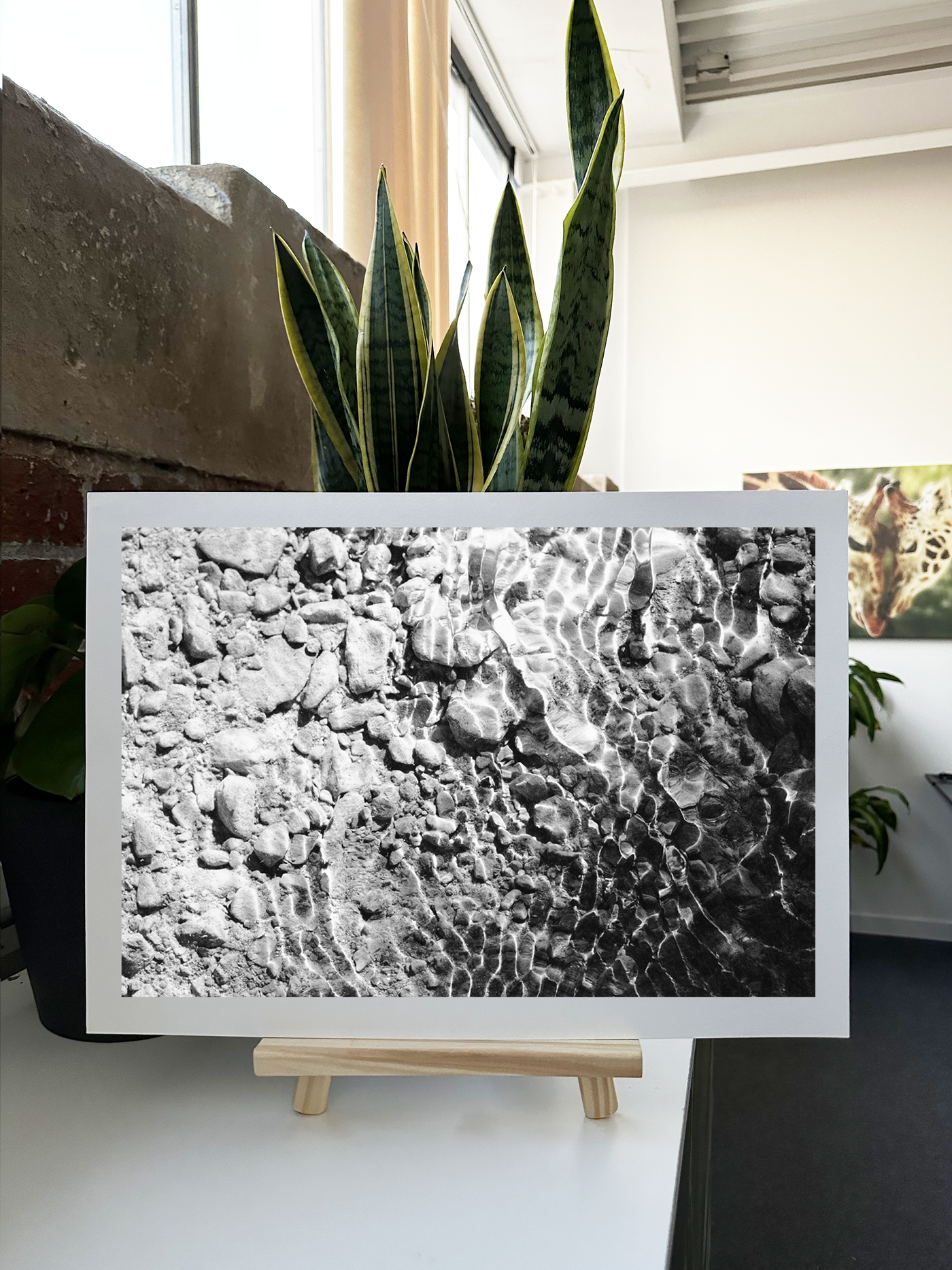 The Monochrome palette explores the rich spectrum of light & dark tones, from bright, almost crystalline highlights to deep, black shadows. Our print enhancement team have carefully preserved every nuance of light and texture, from the intricate ripple patterns to the grainy, sand-like textures that add depth and complexity to the composition. The gradual shift from light to shadow across the frame creates a natural sense of movement and depth.
