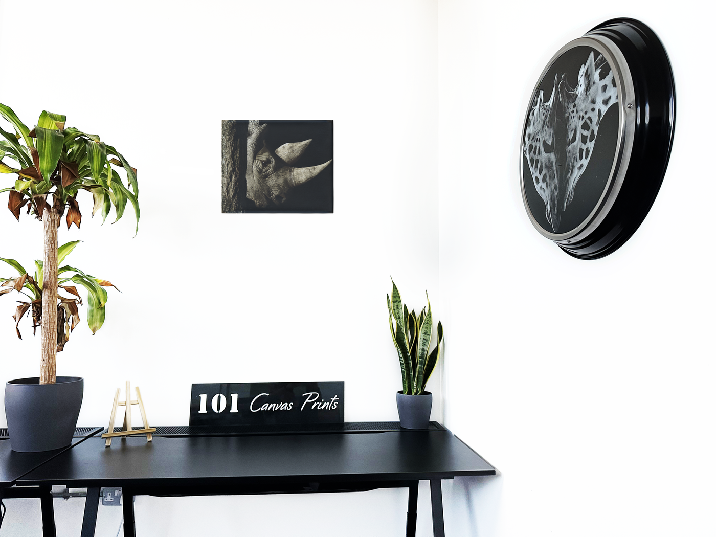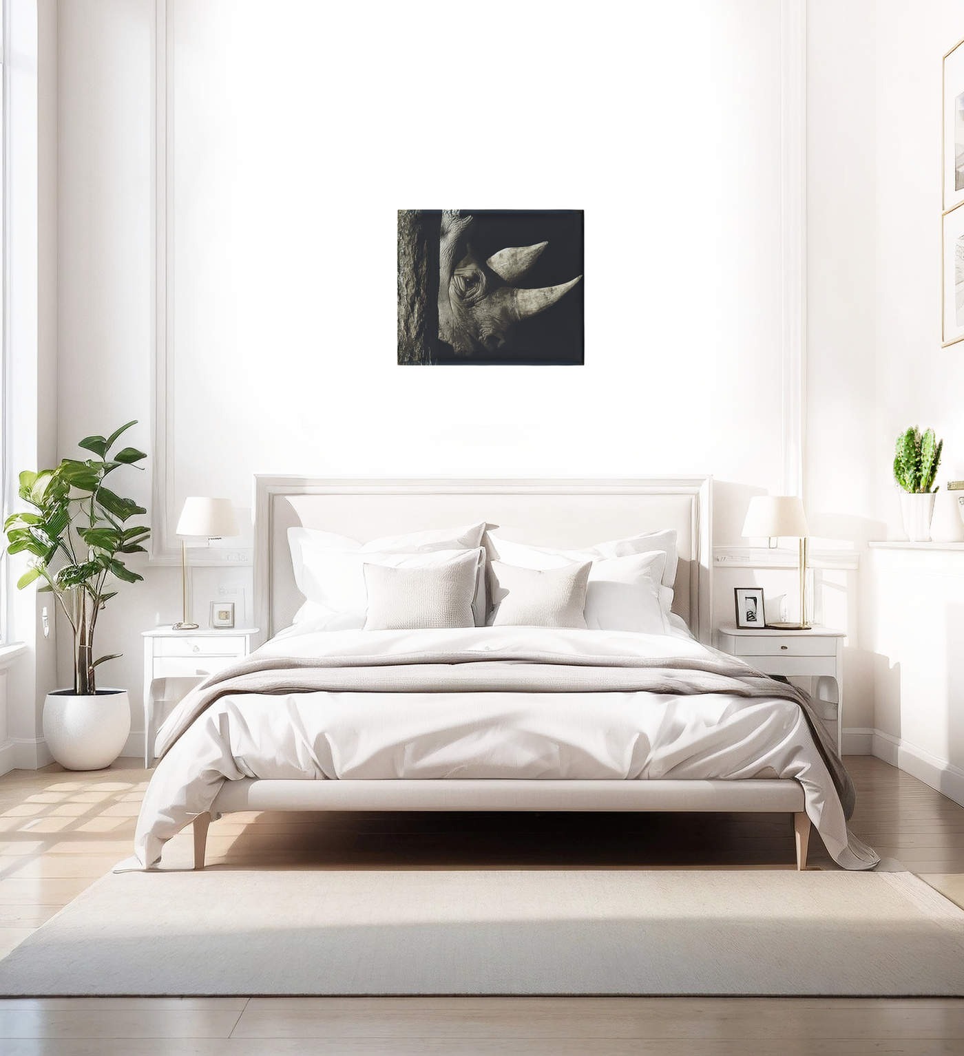 A striking, layering effect makes the photograph of this Rhinoceros against a black background especially striking and beautiful. The Monochrome image works with dramatic lighting to create a photograph with depth and texture, while the focus on the face makes the viewer feel almost as if they are getting a glimpse into its soul. With rich detail and a bold simple design, these prints make an excellent addition to any room and will be sure to capture compliments from family and friends as they enter.