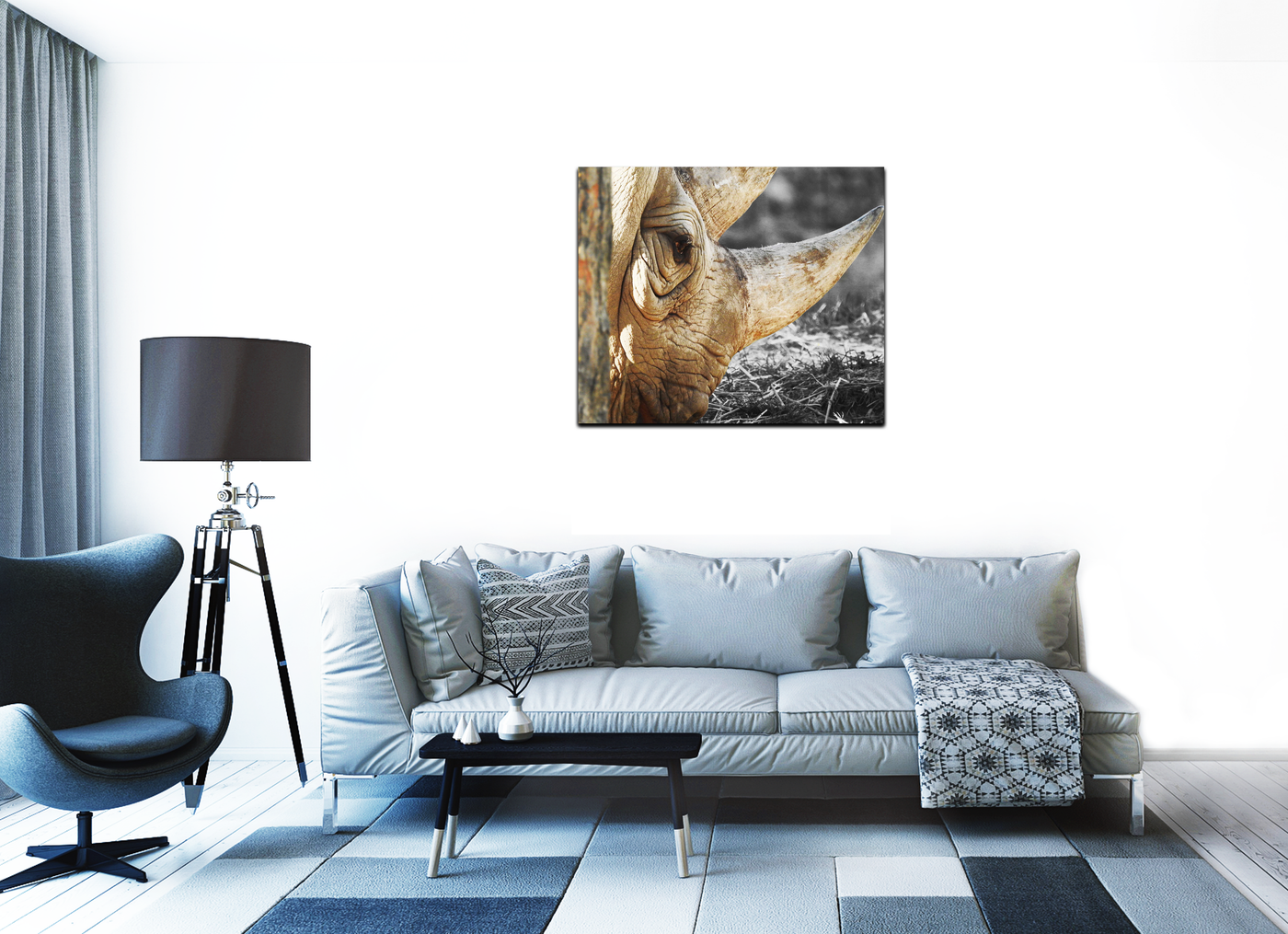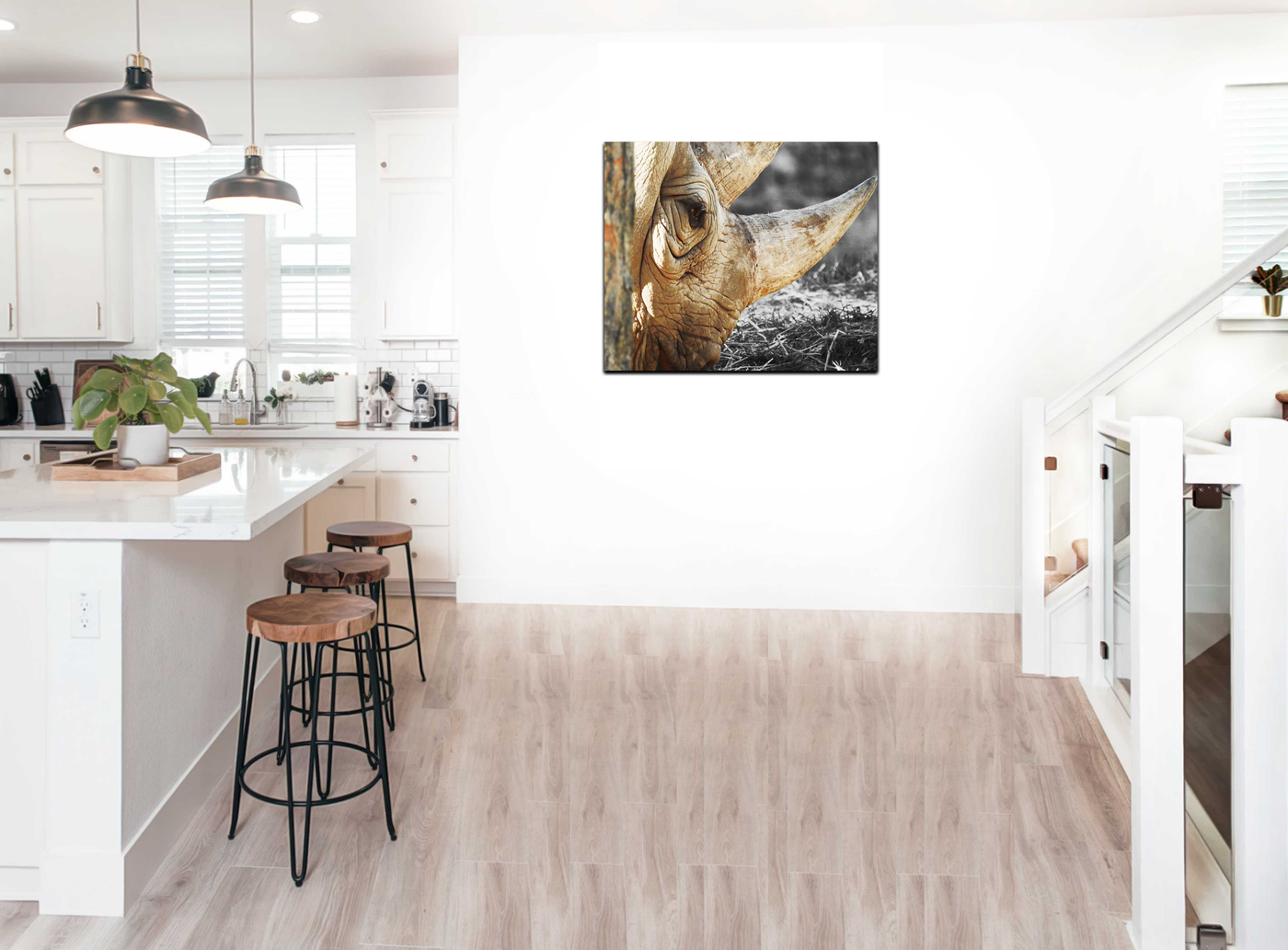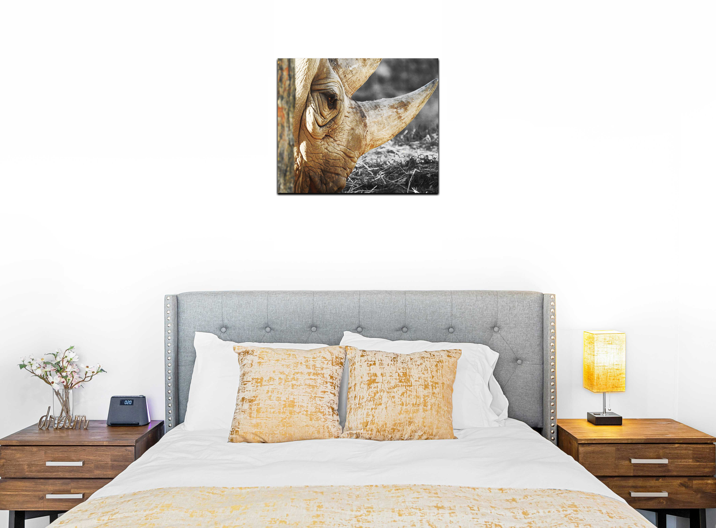 A side profile of an adult White Rhino against a black and white desaturated background. This print is perfect for any animal lover. The artwork is printed on high quality print material and face mounted via lamination onto Acrylic